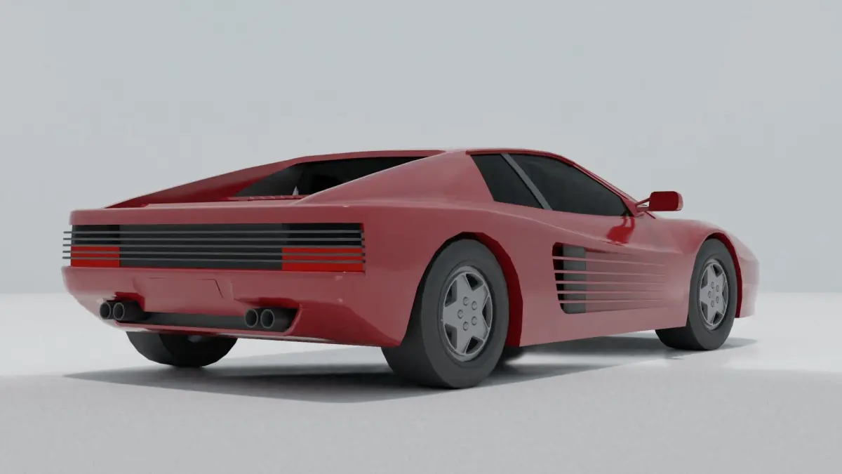 1:1 Scale of a Ferrari Testarossa, complete with an interior and low poly for game use. The model comes in an fbx file for games textured and with materials. Wheels are parented for games to the body. 4 Cameras were used in the blend file. Model rendered with cycles and made with blender.