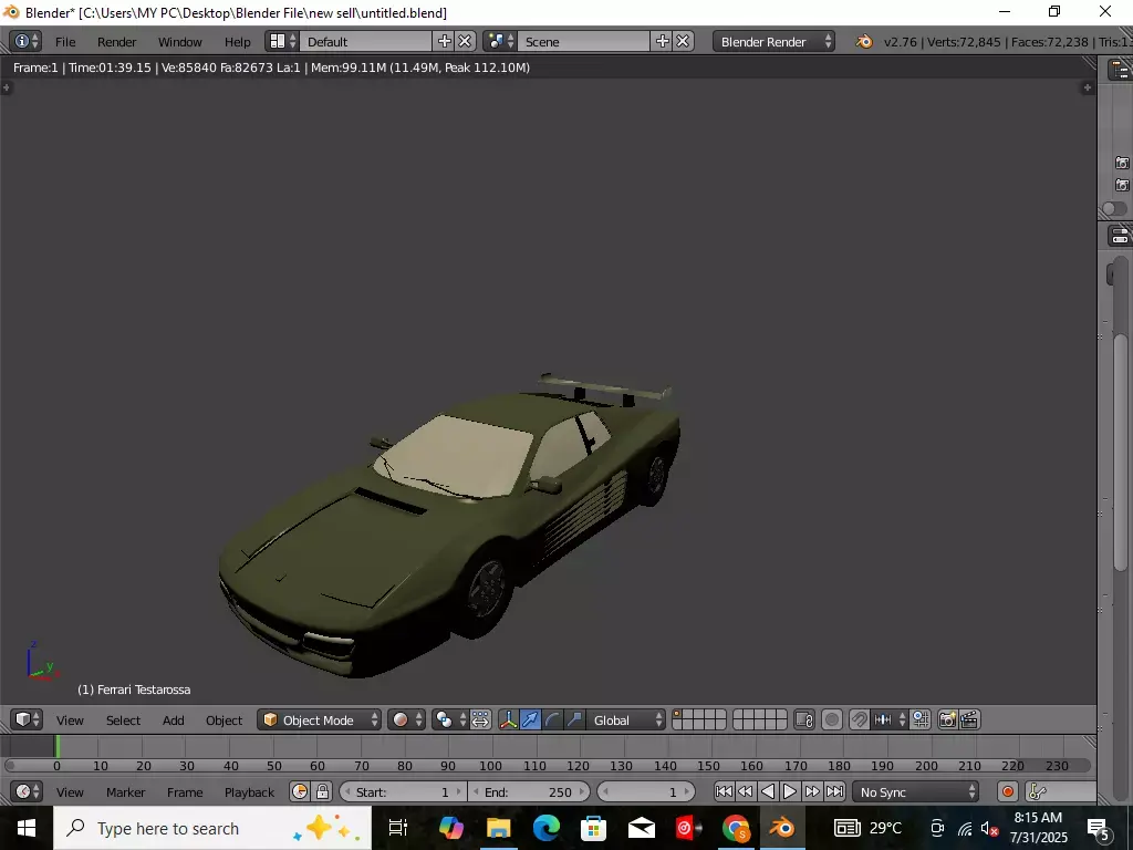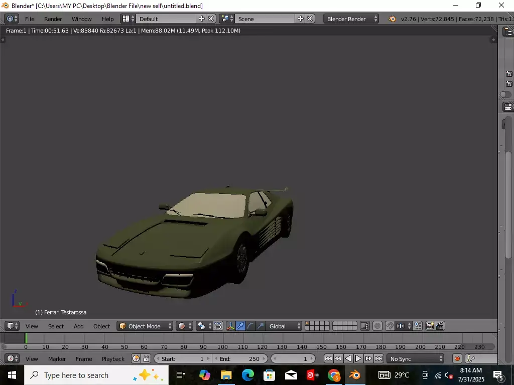 This is a detailed 3D model of the Ferrari Testarossa, an iconic 1980s Italian sports car, modeled in Blender 2.76. The design captures the unique aerodynamic curves and signature side strakes of the classic Testarossa, making it ideal for automotive visualization, games, simulations, and animations.
