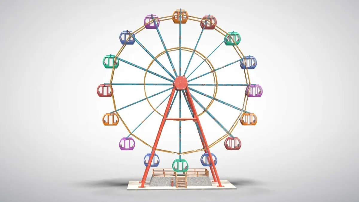 A realistic Ferris Wheel model, created in Blender using the Cycles render engine. It features high-resolution 2048x2048 textures for all elements. This model includes essential PBR textures: Base Color, Roughness, Metallic, and Normal. This model is low poly, very suitable for VR and game projects.
