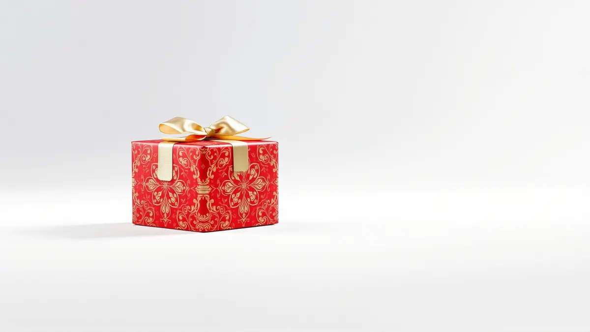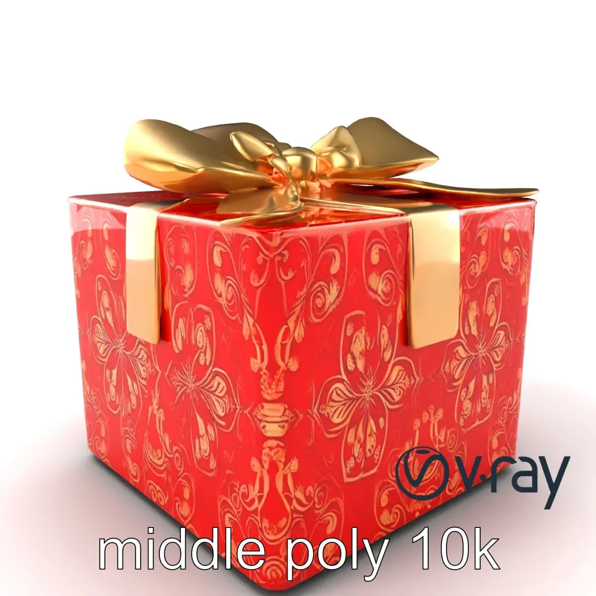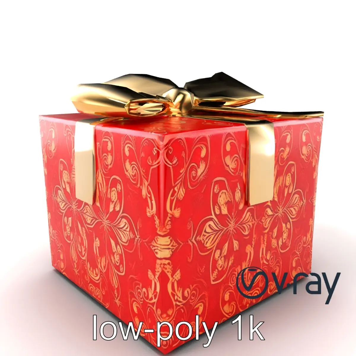 This ornate gift box is ideal for holiday scenes, festive marketing visuals, or as a detailed prop in a virtual store display. Its intricate gold filigree and satin bow add a touch of elegance and sophistication.
