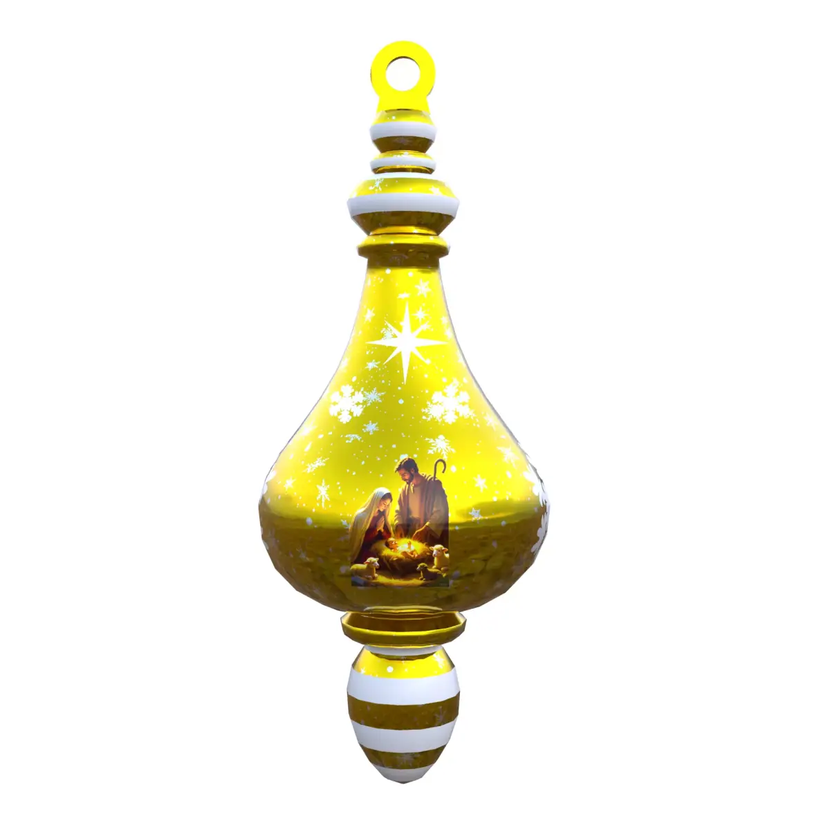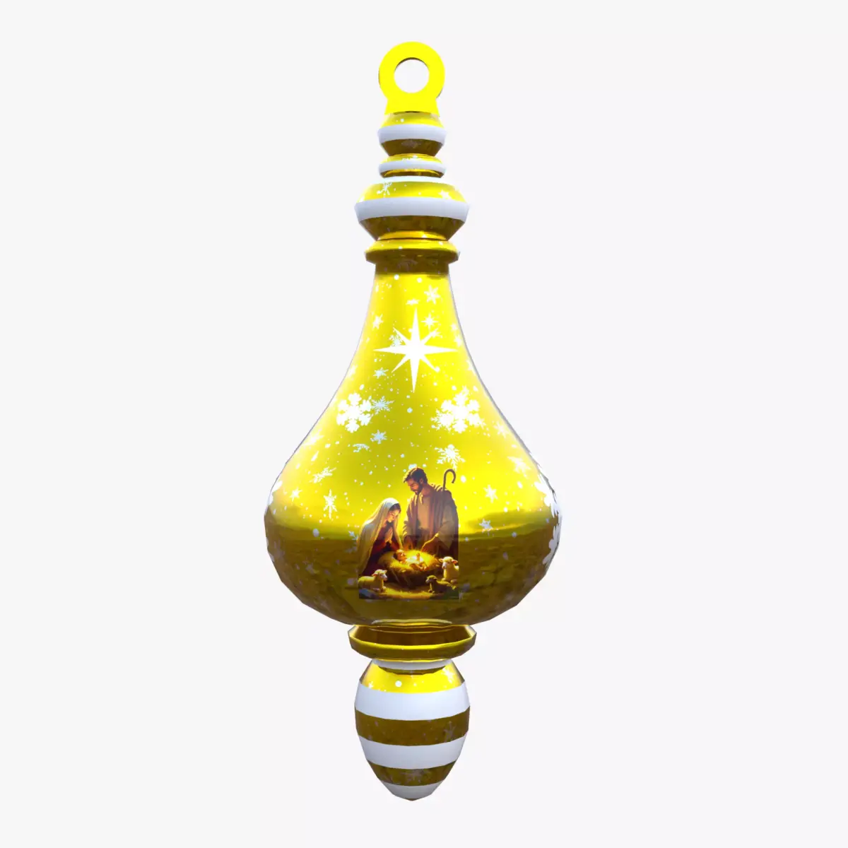 Bring holiday magic to life with this elegant golden nativity bauble 3D model. A must-have for seasonal designs, capturing the essence of Christmas in exquisite detail.Full DescriptionThis 3D model is a high-quality polygonal model with accurate scale and proportions. Low poly, all-quads geometry — clean topology and efficient edge flow. Subdivision-ready: no creases, ensuring smooth results in any 3D software. PBR textures (4K) – Base Color, Roughness, Normal, Metallic, Ao and Displacement maps included. Created in: Blender 4.5 Render Engine: Cycles Geometry: Quads only UVs: Non-overlapping, properly unwrapped. Texture Resolution: 4K (4096x4096) File Formats: .blend, .fbx, .obj, .glb, .usdc Clean naming conventions and organized folders.Tailored for CGTrader creators, this ornate golden ornament showcases a heartfelt nativity depiction inside a teardrop shape, accented by twinkling snowflakes and a central star. Perfect for game assets, product mockups, and digital art, enhancing visibility in holiday-themed searches and boosting downloads.