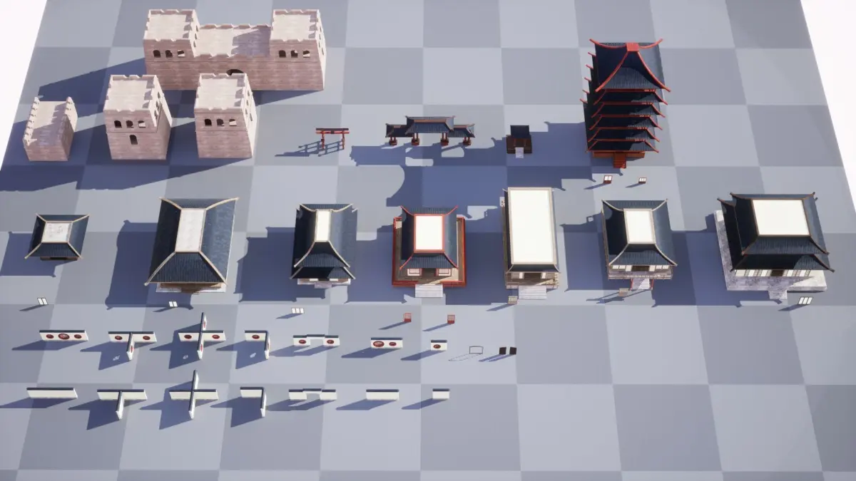 - Variety of Structures: A diverse selection of iconic Asian architectural elements, including temples, torii gates, sections of fortress walls, and traditional watchtowers.