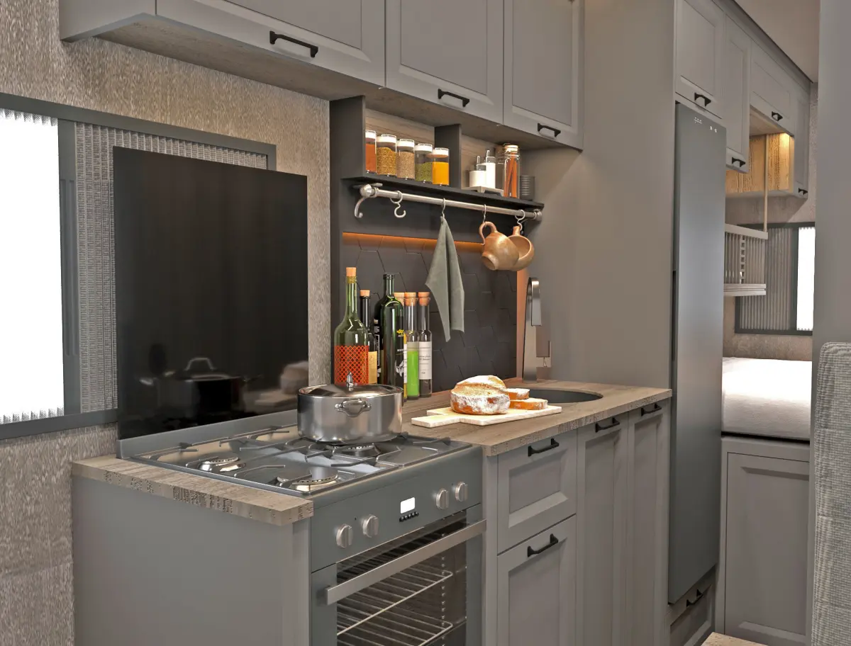 Caravan interior design for 2015 model FIAT Ducato 17m3 panel van. A different design was made for this vehicle. There are luxury materials and production details in this project. the other design was Mediterranean and Aegean themed.