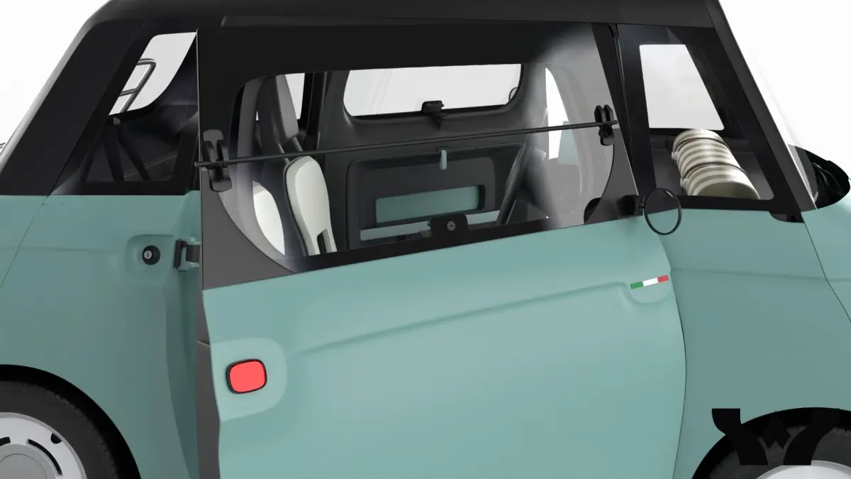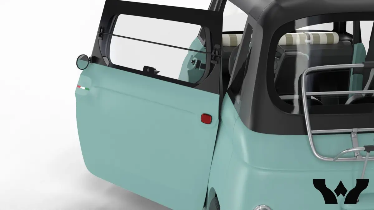 The Fiat Topolino electric car is a close relative of the Citroen Ami. It differs from its counterparts in its retro design with large round headlights and embossing on the body. The car doors open in different directions.