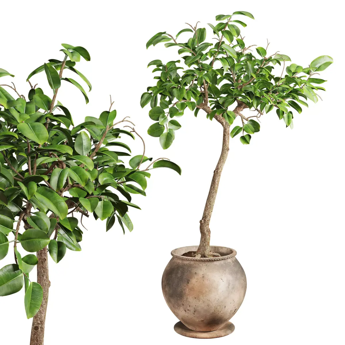 This high-quality 3D model showcases a realistic indoor ficus tree with vibrant green leaves and a naturally shaped trunk. The plant sits in a handcrafted aged terracotta pot with a rounded body and subtle decorative lip. The pot texture was carefully developed in Substance Painter, giving it a realistic worn and weathered ceramic finish with earthy color tones, ideal for rustic, wabi-sabi, or natural-styled interiors.