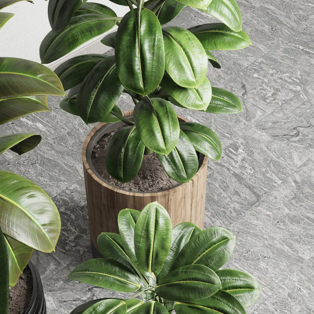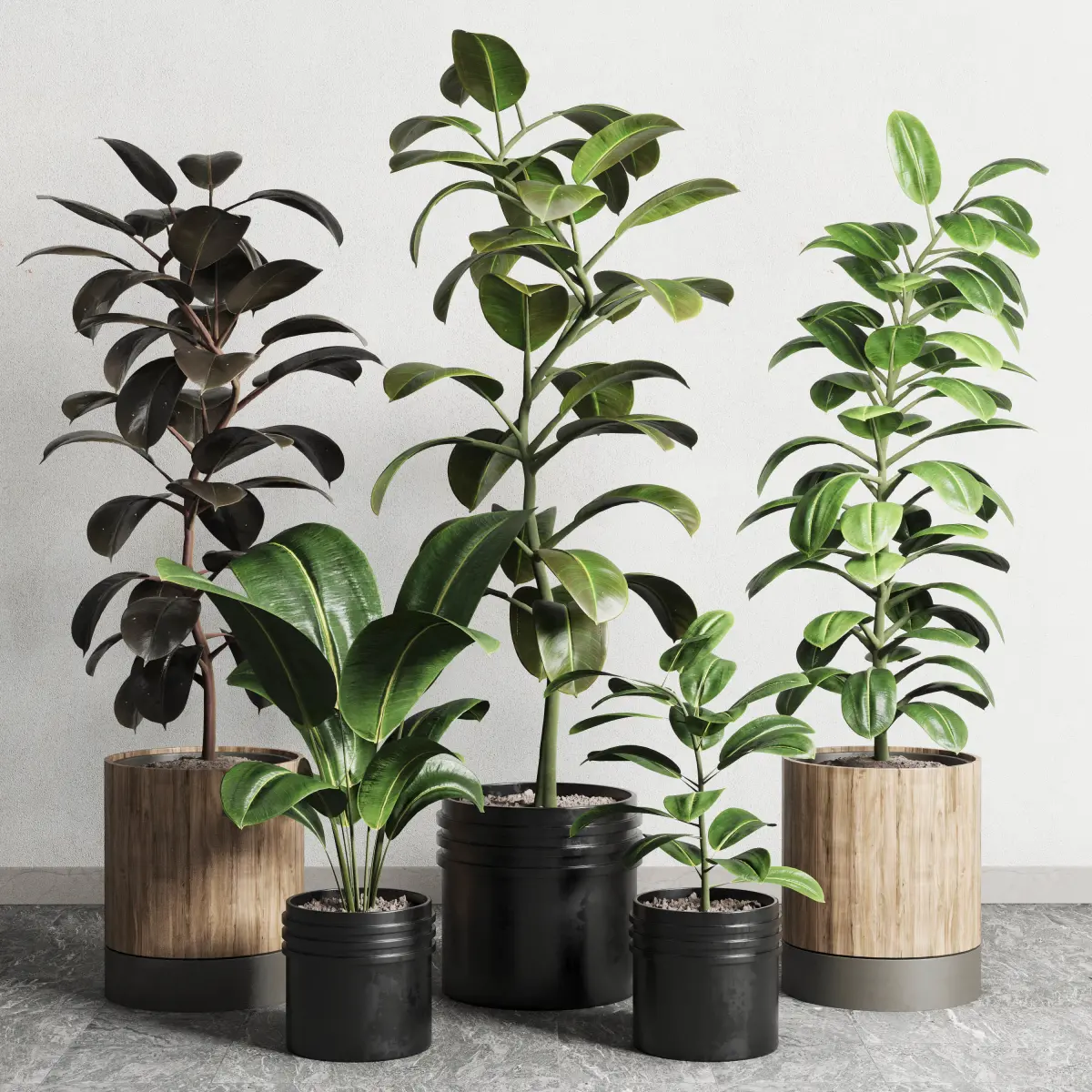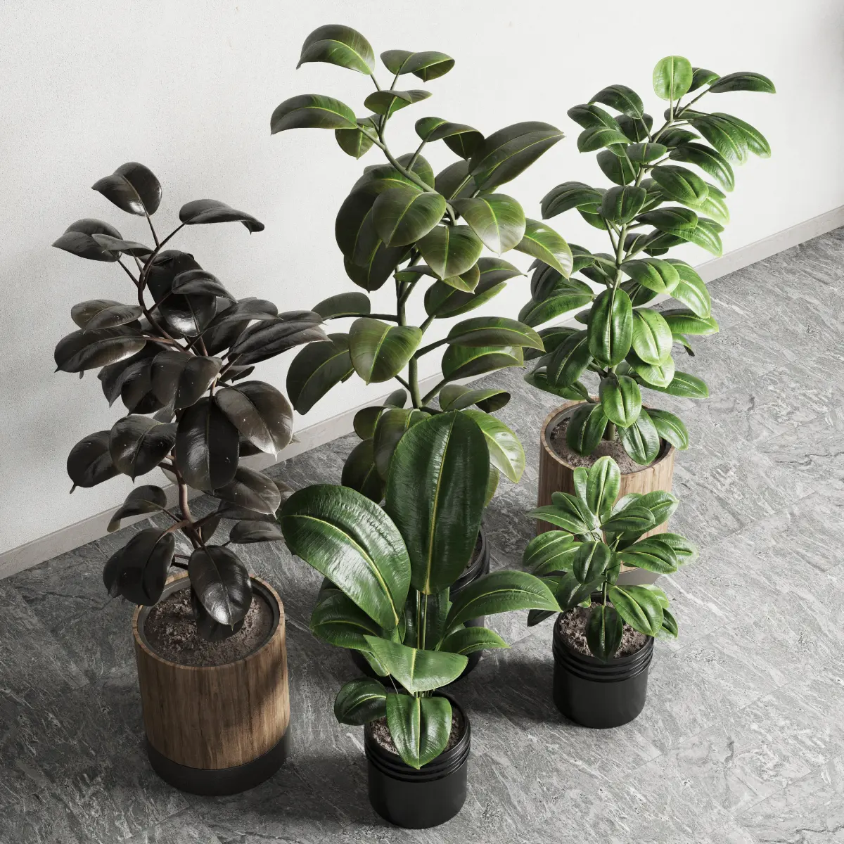 ficus rubbery plant Collection dirty wooden and plastic pots 3D model