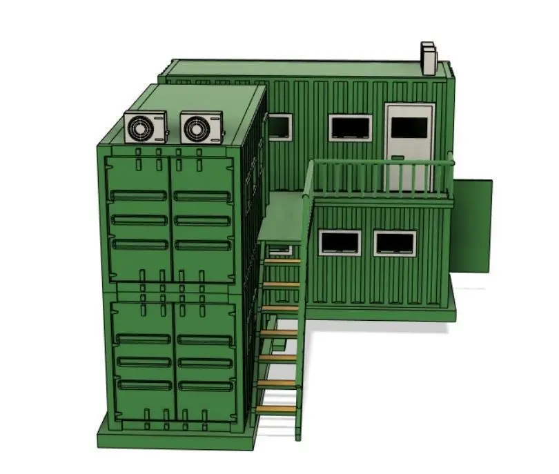 This is model of a field office for diorama or a model train layout.All parts should be printed using SLA/resin printer for their detail and intricacy.The model was desiged in HO scale.The base of the container and the second floor has hole in it to insert wiring for lighting.