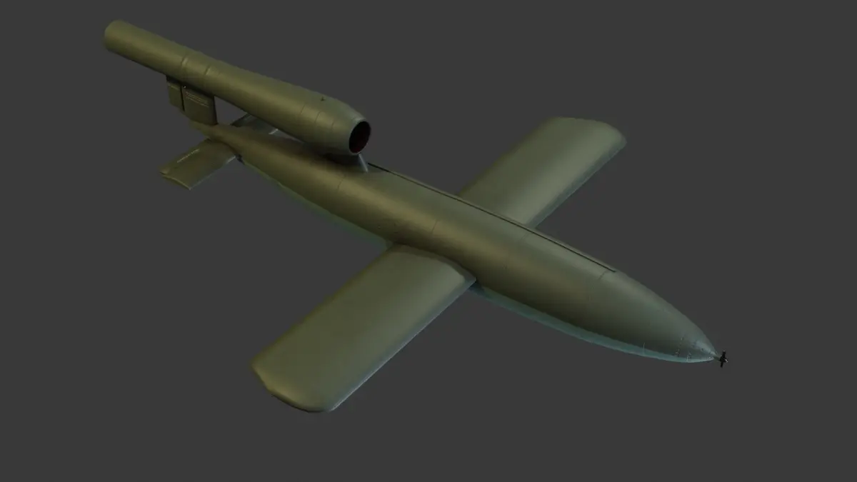Low poly model of Fieseler Fi 103 flying bomb/cruise missile equipped pulse jet engine. Also known as Vergeltungswaffe Eins (V-1) or Vengeance Weapon. Allies called it buzz bomb or doodlebug. This weapon was used by Germany (Third Reich) during World War 2.