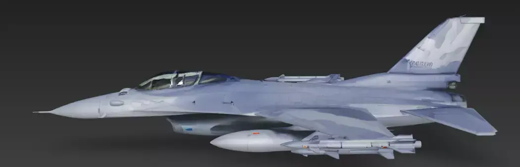 Detailed exterior geometry, including wing structures, control surfaces (ailerons, flaps, elevators, and rudder), and engine nozzle.Armament loadout: Wingtip-mounted AIM-9 Sidewinder missiles, under-wing pylons with additional air-to-air missiles (such as AIM-120 AMRAAMs), and a centerline external fuel tank for extended range missions.Cockpit details visible through the transparent canopy, including pilot seat and basic instrument panel.Landing gear bays and doors modeled for added realism.High-resolution textures for metallic surfaces, rivets, panel lines, and markings (e.g., USAF on the tail fin and serial numbers on the fuselage).