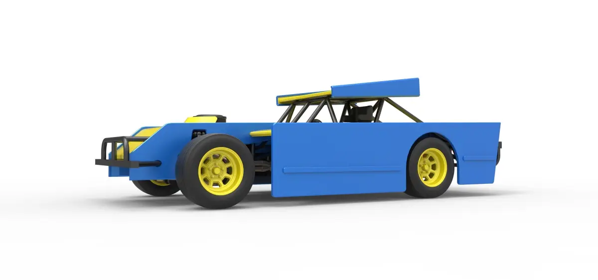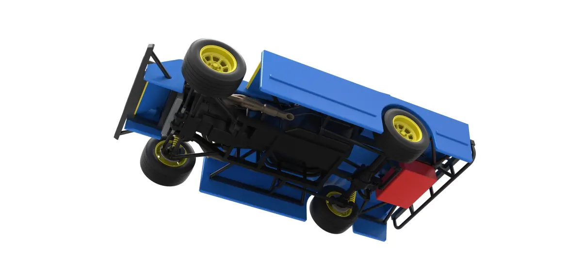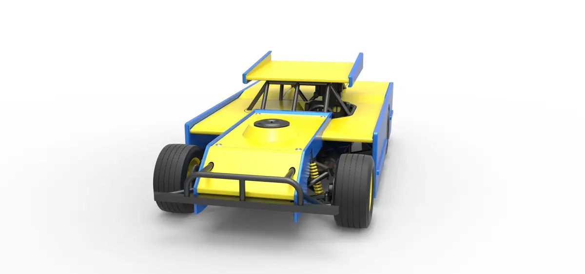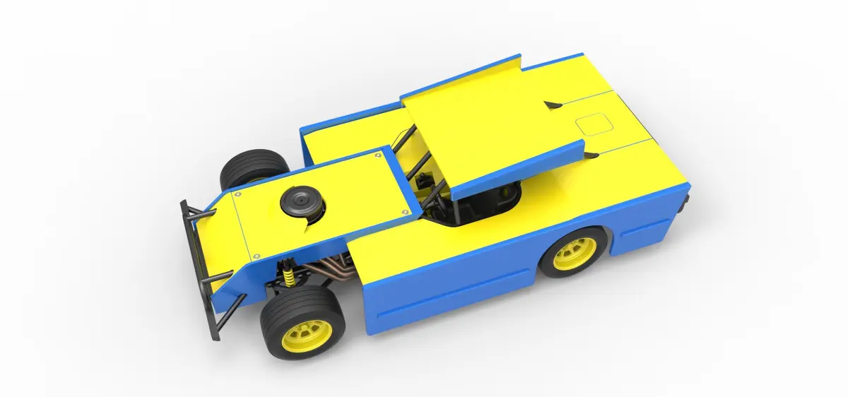 The model consists of parts: Air filter cap, Air filter, Engine, Frame, Front bumper, Left exhaust, Radiator, Right exhaust, Rims, Rods, Seat, Shell, Shifter, Steering wheel, Tank, Tire, Top wing.