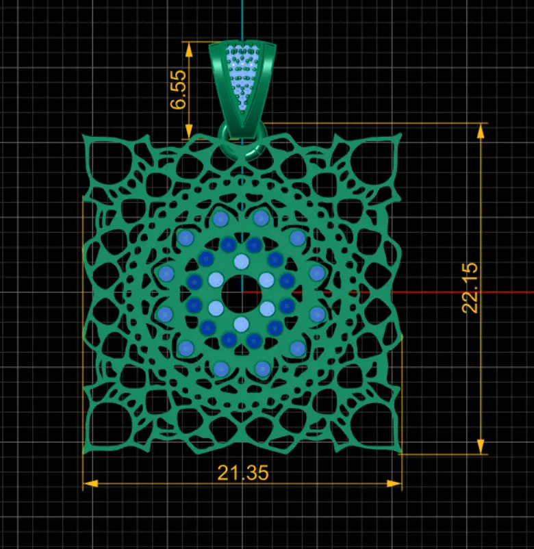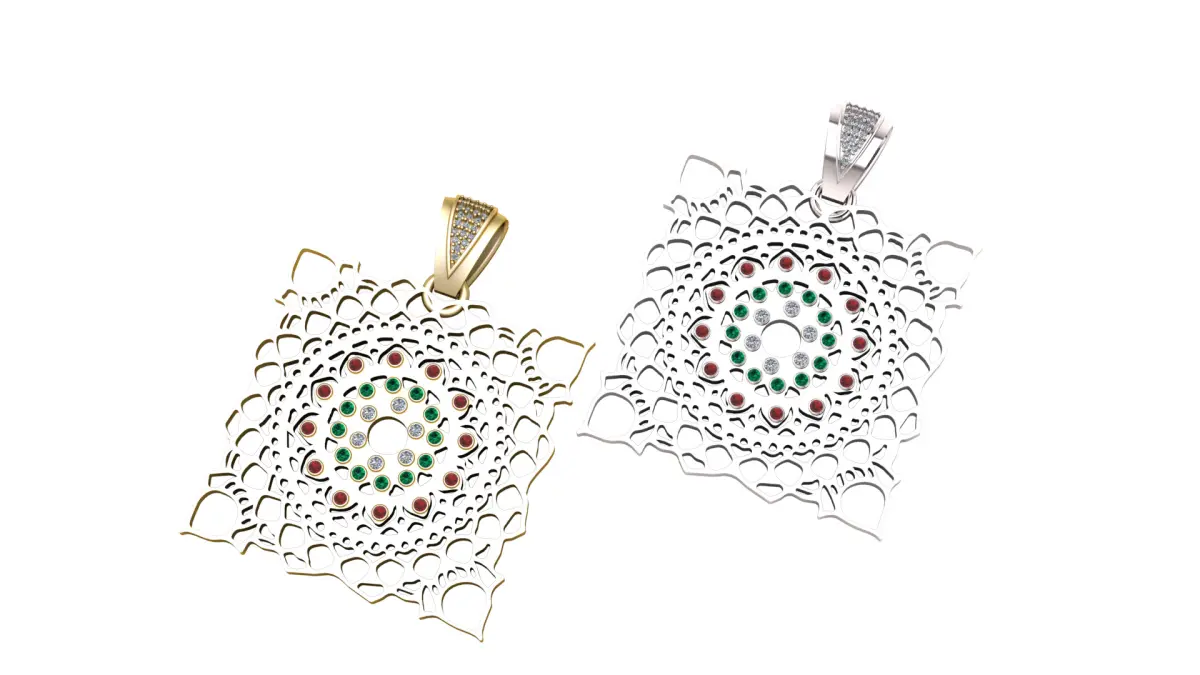 This exquisite pendant showcases a stunning square-shaped filigree design, intricately crafted with precise cutwork that radiates a mandala-inspired motif. The center features concentric circles of vibrant gemstones, including shimmering white, deep green, and rich red stones, adding a captivating pop of color. The polished gold frame enhances the luxurious appeal, while the diamond-studded bail offers a sparkling touch of elegance. Perfect for adding a statement to any outfit, this pendant combines traditional artistry with modern sophistication.