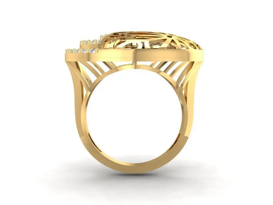 Files are provided in STL, 3DM and OBJ formats. The default size is 17 millimeters with an approximate weight of 7 grams in 14K gold. The design includes multiple round stones of 1.2 to 1.5 millimeters set in spiral formation. This model is ideal for jewelers, designers and 3D artists who want to create a bold cocktail ring or a luxury fashion accessory ready for manufacturing and rendering.