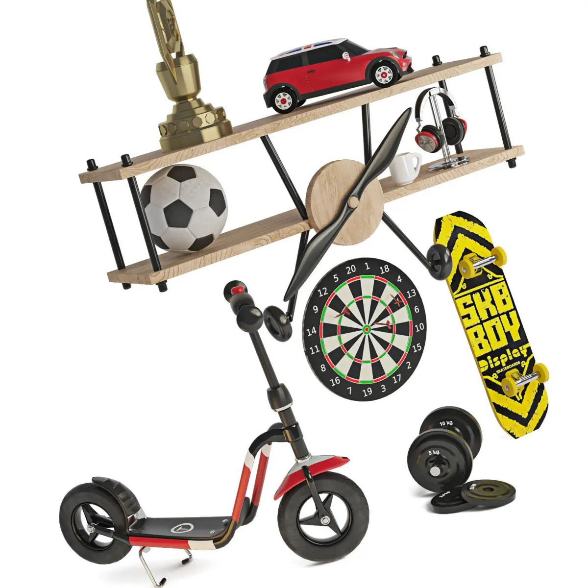 Model filling the children's room for a guy. Can be used in children's, gaming, subject visualization. The kit includes a machine, a scooter on the bandwagon, a skate, dumbbells of different weights, an airplane shelf, a winner's cup, a dart board, a headphone stand and a cup.