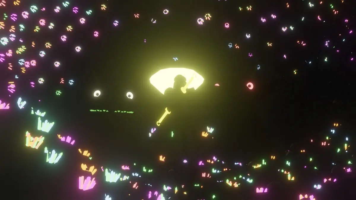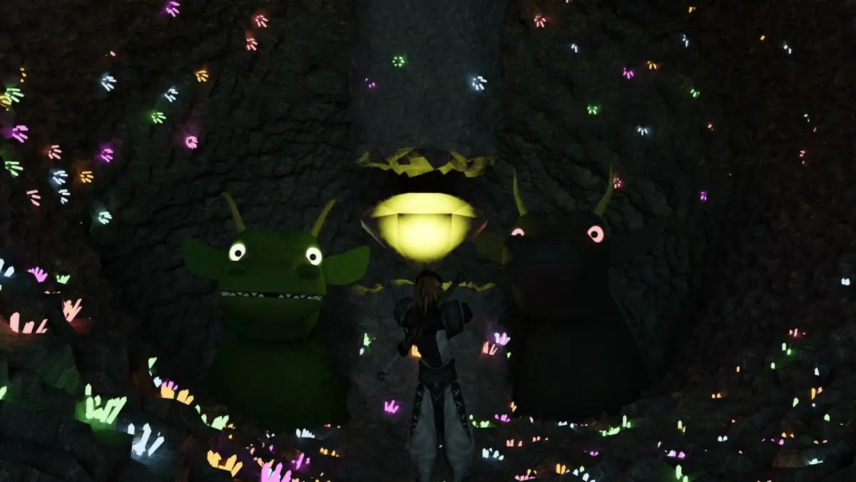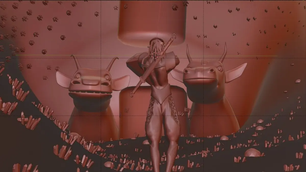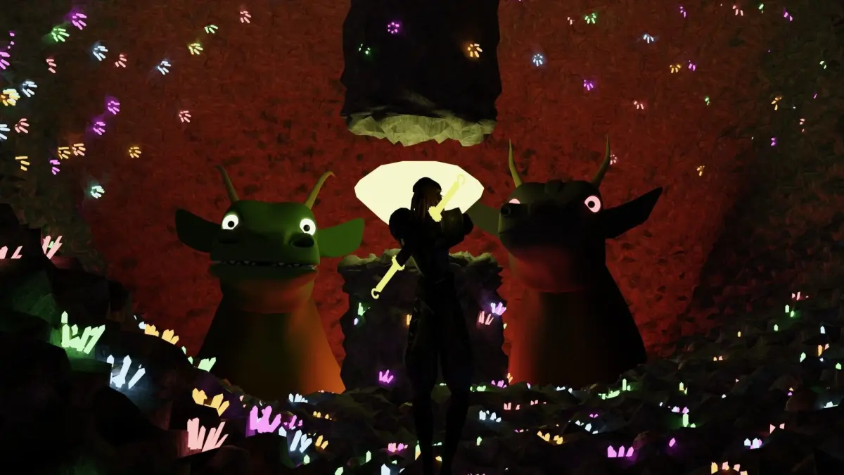 A scene that shows a character standing before two giant beasts in a cave system filled with precious gems. Contains: A sculpted model of two monsters, a model of a character, a model of a cave, and gems.