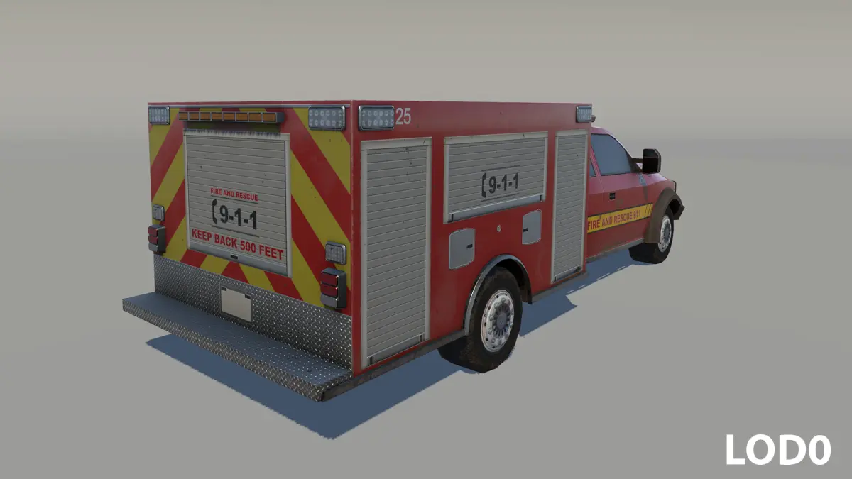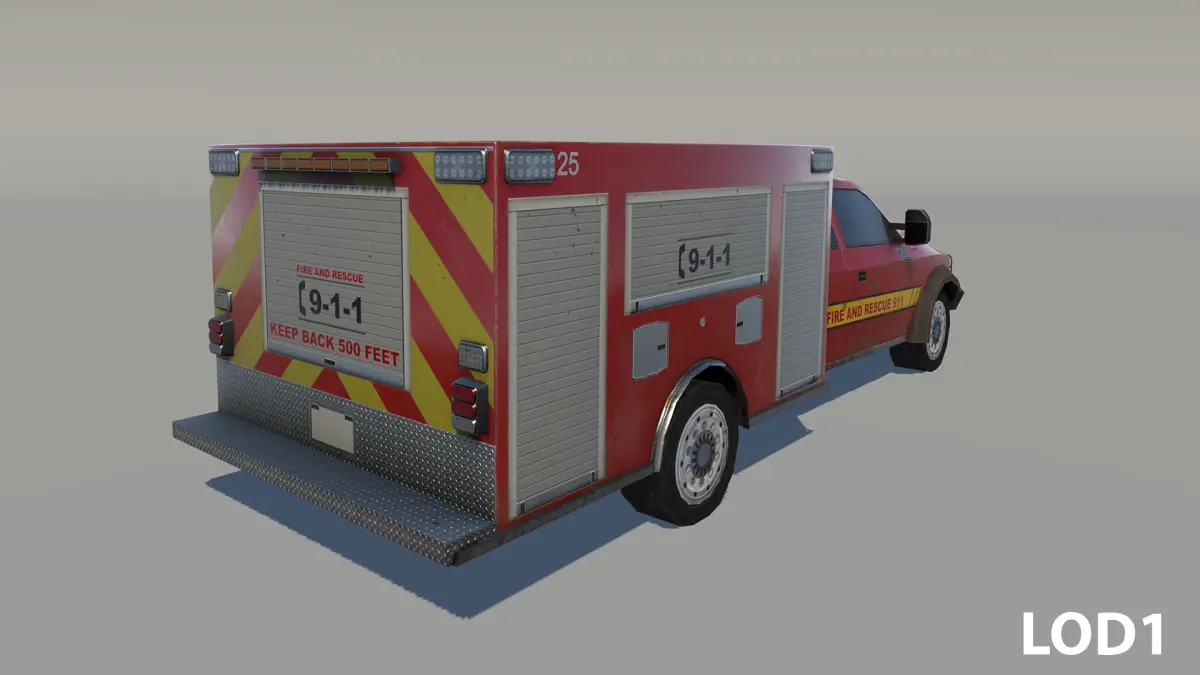 The firetruck includes 2 levels of detail (LOD), with a dedicated texture set for the wheels.