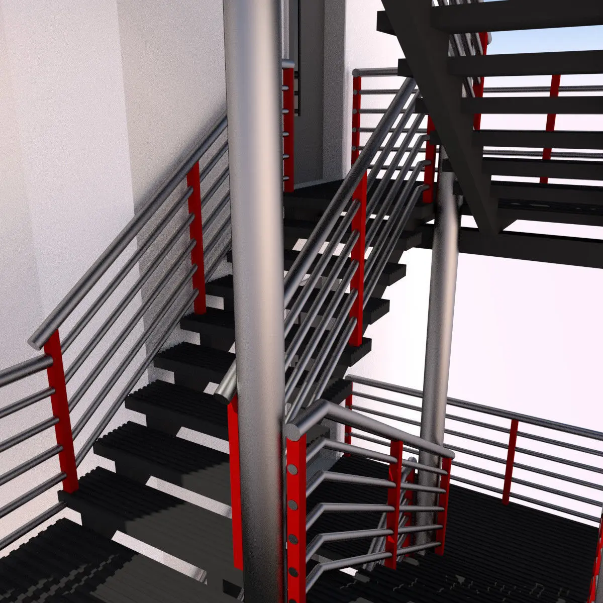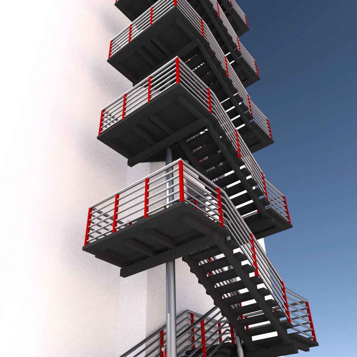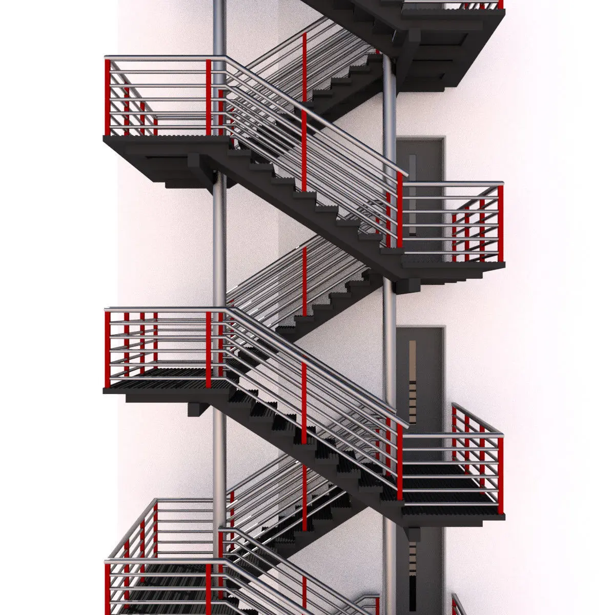 Modular fire escape stairs. Modern style fire stairs with red and shinny railings. Well finished for outdoor architectural city buildings models, but also can be use indoor, because a fresh style.