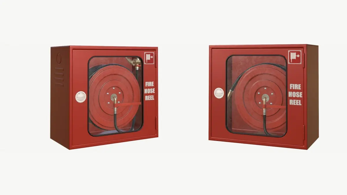 Detailed 3D model of a 3d PBR fire Hose reel glass box .