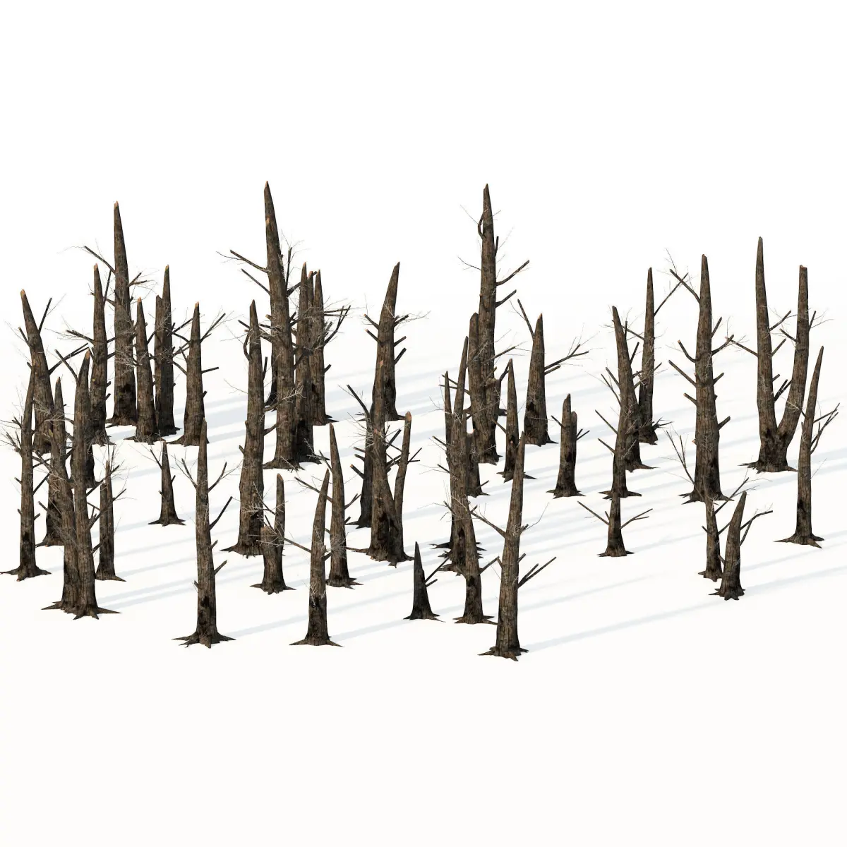 Highly detailed and low poly 3d model of burned standing dead trees.This model features the charred and burnt appearance of trees that have been killed by fire. This can be used to create realistic scenes of forest fires or post-apocalyptic environments.It ideal for games and other applications where performance is important.the tree branched are rigged and animated.