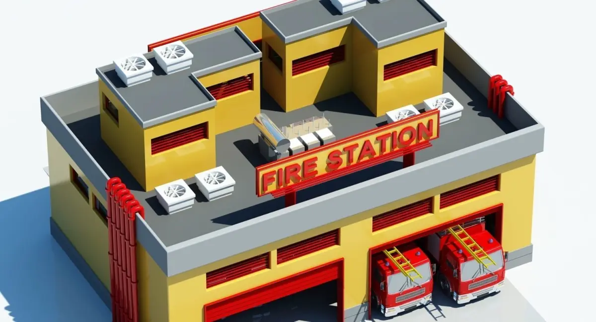 Detailed 3D Model of a Fire Station building symbol.Fire trucks are included as shown in previews.