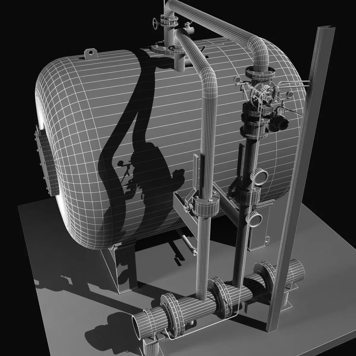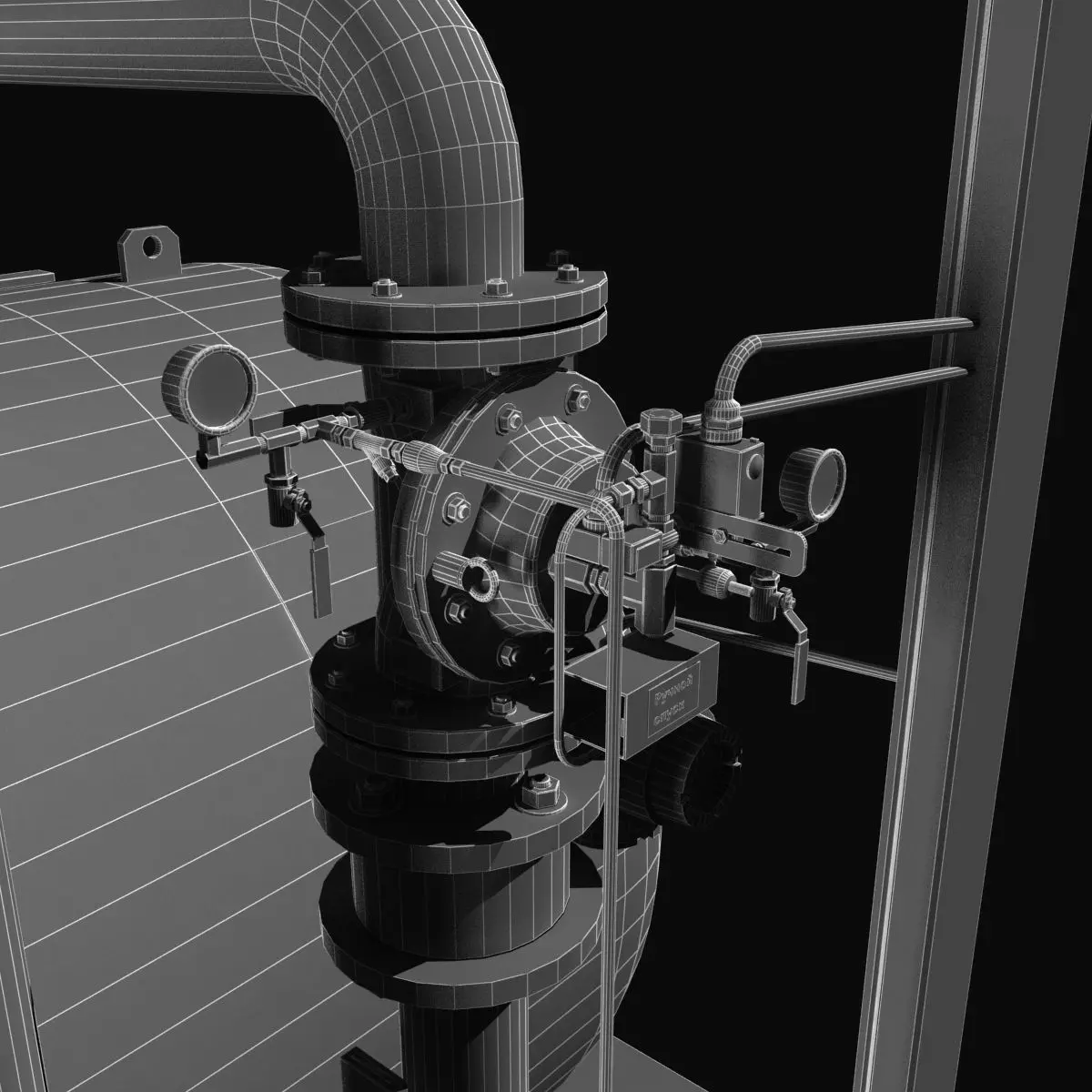 This is high poly fire water tank.This is part of fire extinguishing system.This model consist of water tank, manometers, electrical controlled taps, electrical controlled valve.On vater tank situated a lot of taps for differenet purposes.Model contain water measurement system.Valve connected to perforated vertical electrical box.Textures included.
