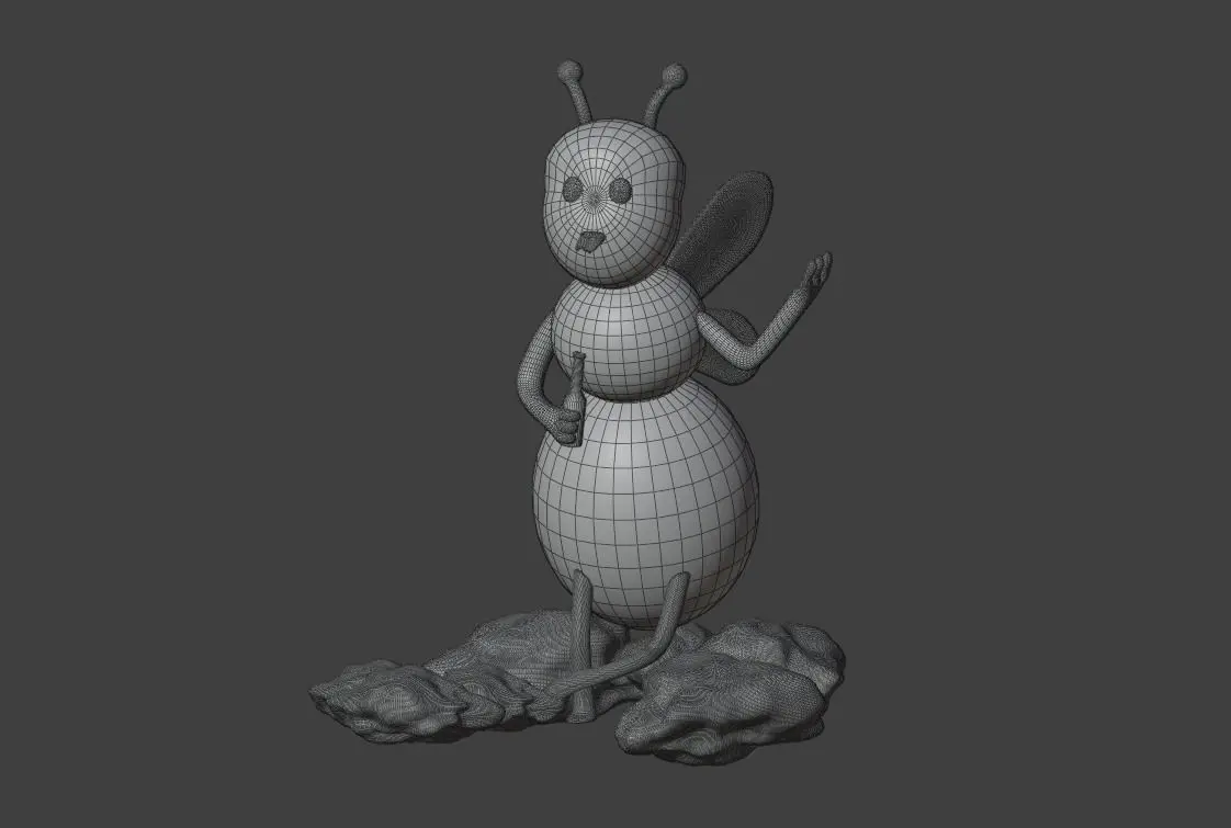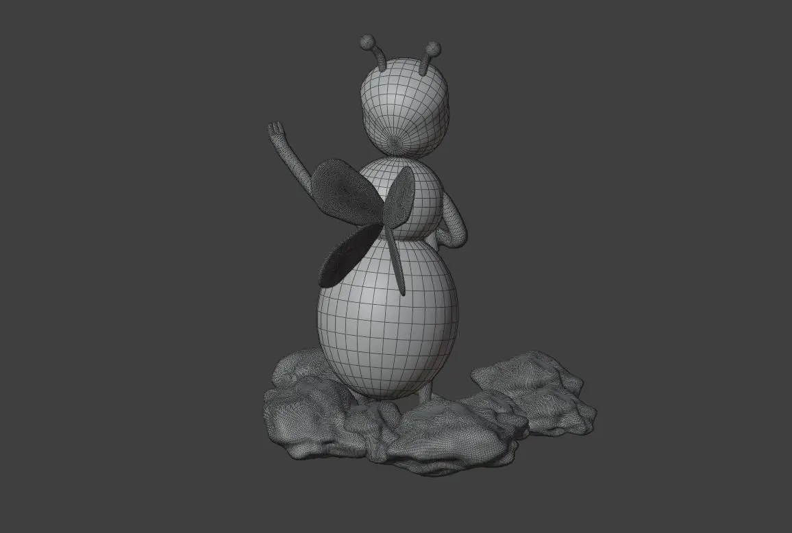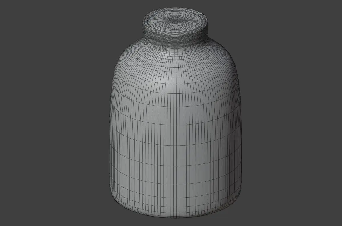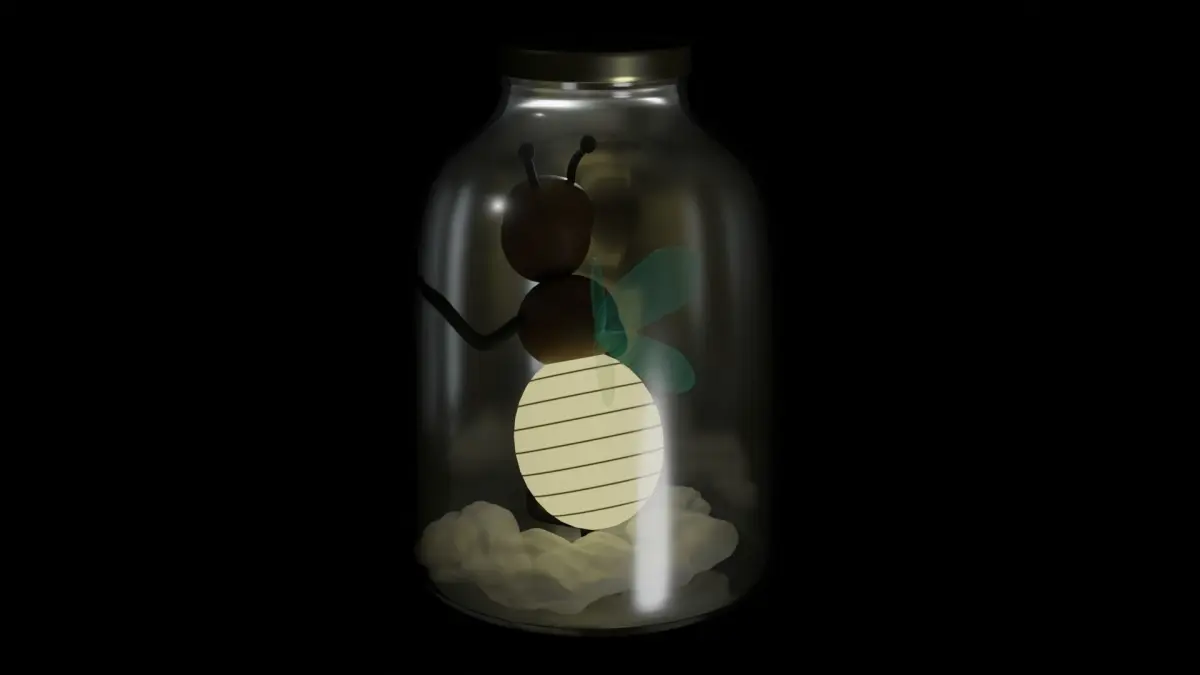 This 3D scene contains a drunken firefly that has blue transparent wings, it is brown, also has a light underparts. He has two arms and legs. The jar is made of glass, with a metal lid on top. The model was created in 3D Blender.