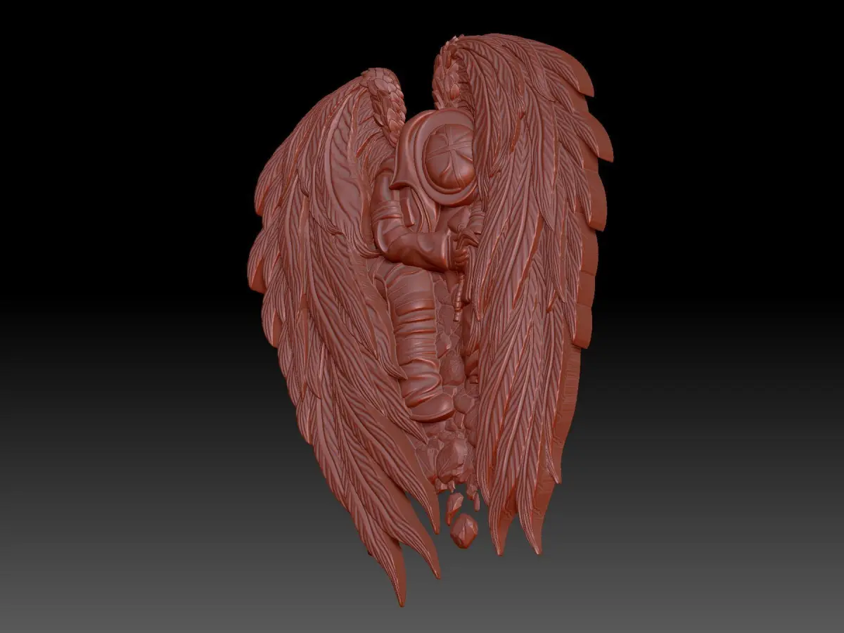 3D model of the bas-relief Fireman. The image shows a tired man in a fire uniform. He bowed his head, conveying the burden of responsibility to the profession. Behind his back are wings that enhance the symbolism and depth of the composition. The project is ideally suited for 3D printing and CNC machine operation.