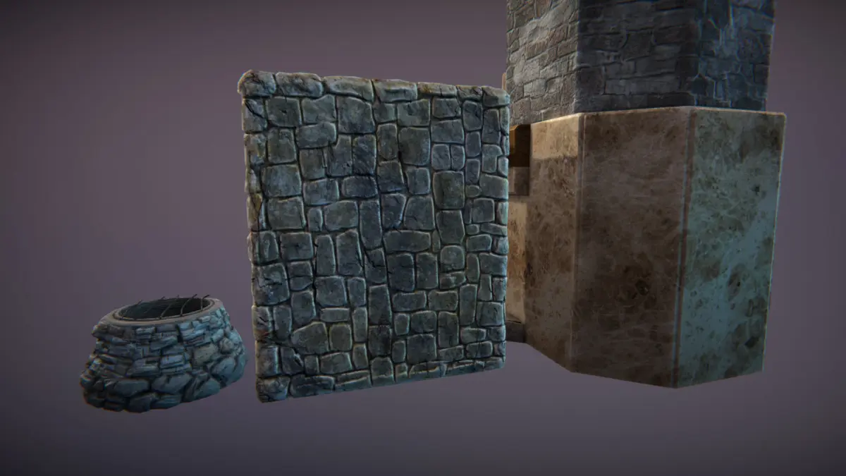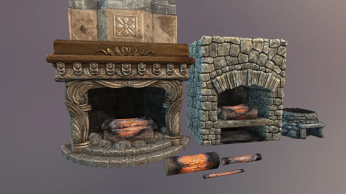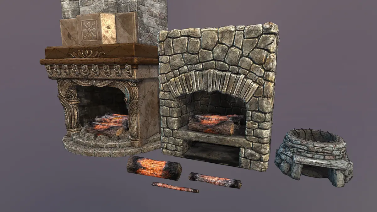 Fireplace and hearths - 6 separate meshes, fireplace, big hearth, small hearth, and 3 burning logs. All textures are 2048x2048, total triangle count around 20000 tris.
