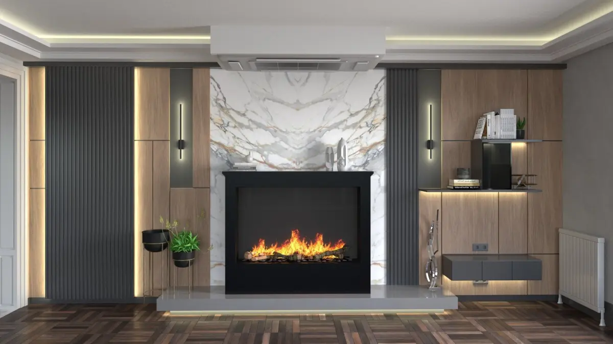 Every detail in this special design has been thoughtfully prepared. From wall sconces to the fireplace, decorative wooden panels, bookshelf shelves, and drawers – each element enriches your interior design. The warm glow from the fireplace adds both temperature and comfort to your room, surrounded by decorative wooden panels that bring a modern touch to your space.