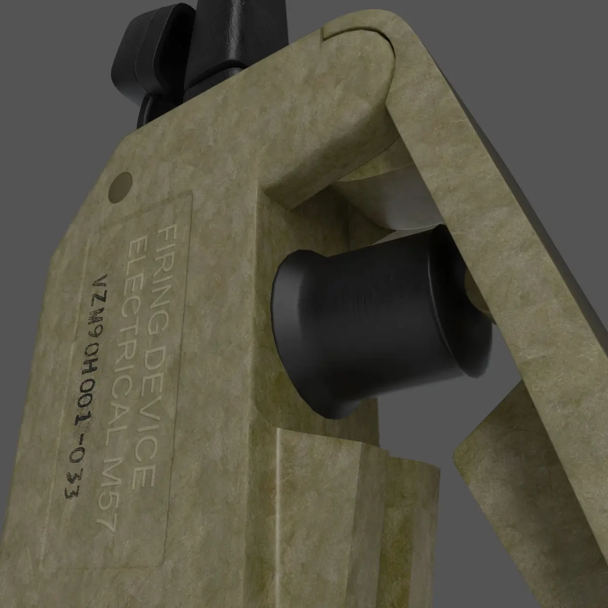 DescriptionThe M57 Electrical Firing Device for a Claymore mine is a green plastic rectangular shape with handle at the top. Underneath the handle is a rubber button. When the handle is pressed and hits the button the device produces a double (one positive, one negative) 3 volt electric pulse of energy to fire the electric blasting cap.