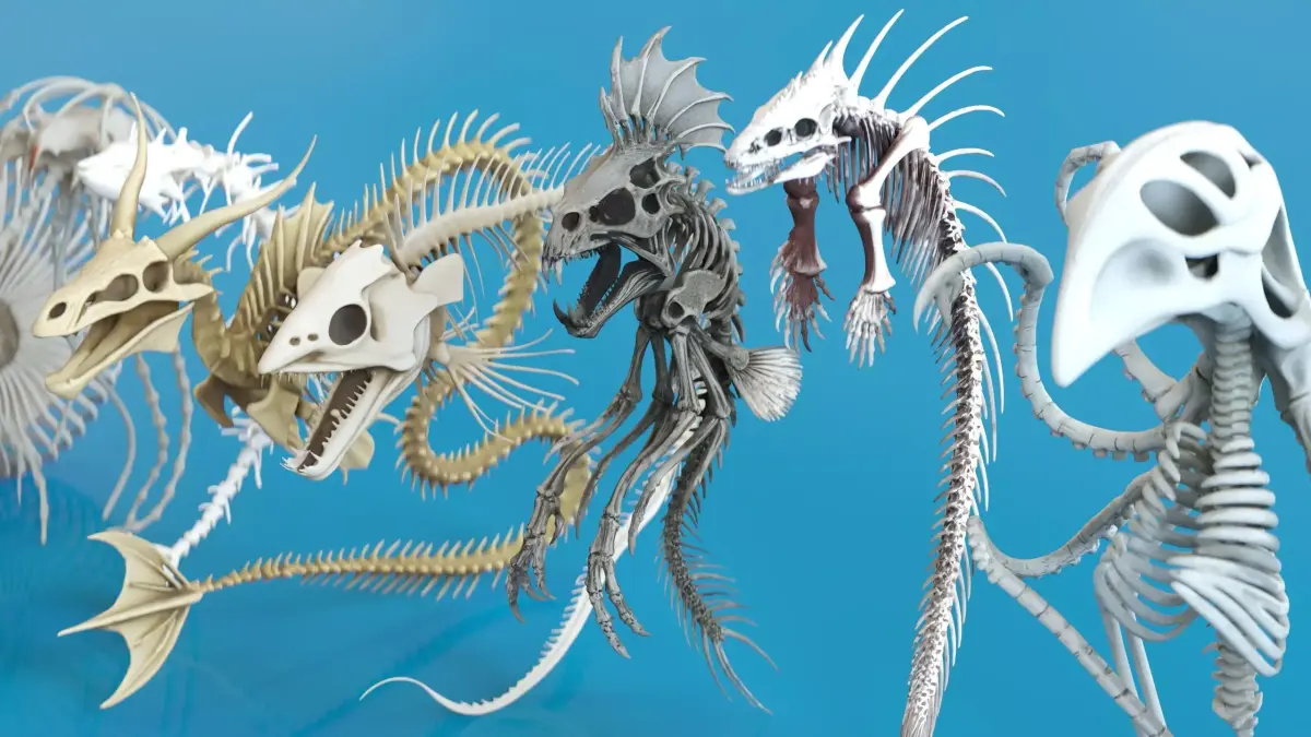 Fish and Underwater Creatures Skeleton Collection is a large-scale 3D asset pack featuring a diverse library of marine skeletal structures. The collection includes fish skulls, full fish skeletons, deep-sea creature bones, rib cages, vertebrae, and stylized marine skeletal formations inspired by real aquatic anatomy.