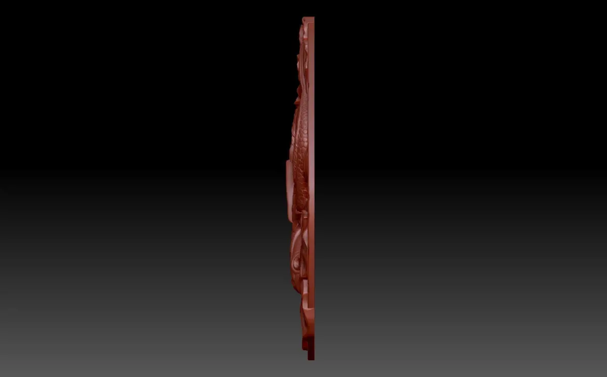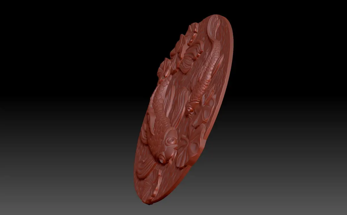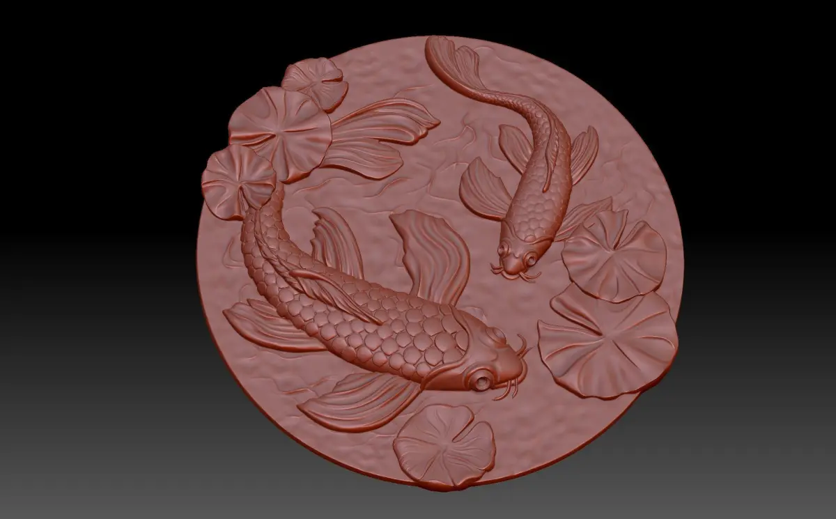 A 3D model of a bas-relief decorative panel depicting fish swimming in water among water lilies. Light ripples are visible on the surface of the water, which gives harmony and integrity to the whole composition. It is a beautiful and peaceful piece that is ideal for 3D printing and processing on a numerically controlled machine.