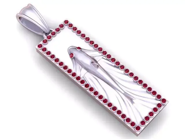 This is a rectangular gold pendant featuring a beautifully sculpted long-finned fish in graceful motion. The fish is elegantly carved with flowing fins that extend across the pendant, creating a sense of movement and life. Its eyes and border are adorned with ruby gemstones, giving the design a rich, luxurious sparkle. Symbolizing prosperity, luck, and flow of life, this pendant blends nature’s beauty with refined craftsmanship.