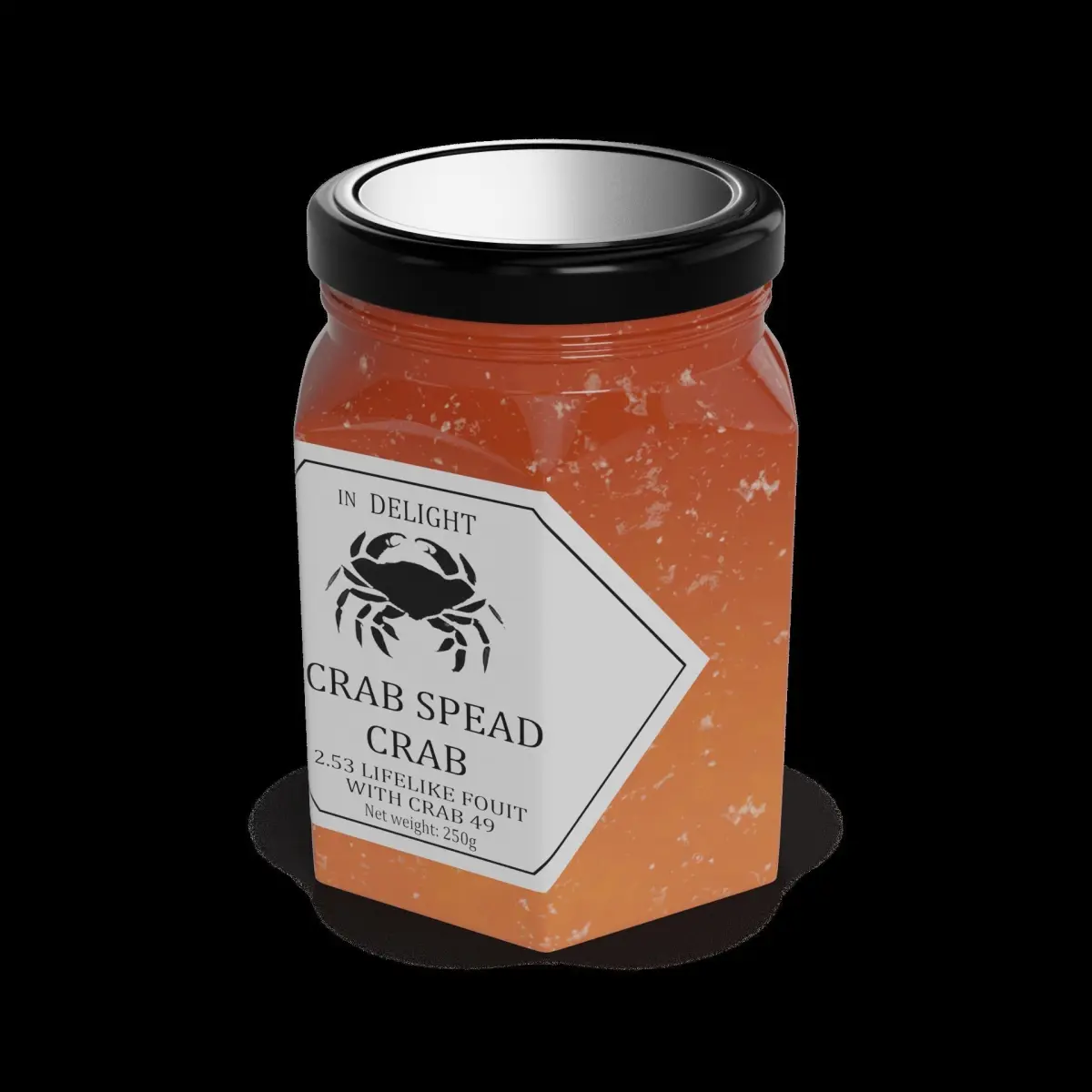 Crab Spread: Delight in the delicate taste of crab with our Crab Spread, packaged in a hexagonal glass jar. The jar is adorned with a label featuring a lifelike illustration of a crab and the words Crab Spread in a sophisticated font. The jar is sealed with a black twist-off lid. Net weight: 250g.