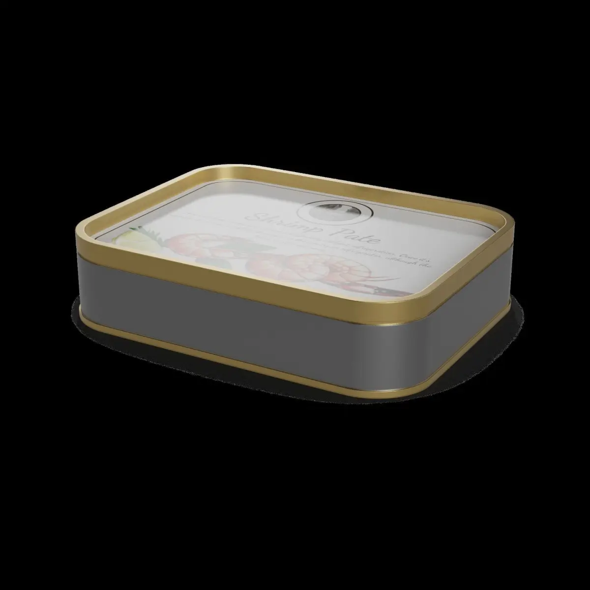 Shrimp Pate: Indulge in the smooth and velvety texture of our Shrimp Pate, presented in a rectangular metal tin. The tin is decorated with a label showcasing a mouthwatering image of shrimp and the words Shrimp Pate in elegant script. The tin can be easily opened with a pull-tab lid. Net weight: 120g.
