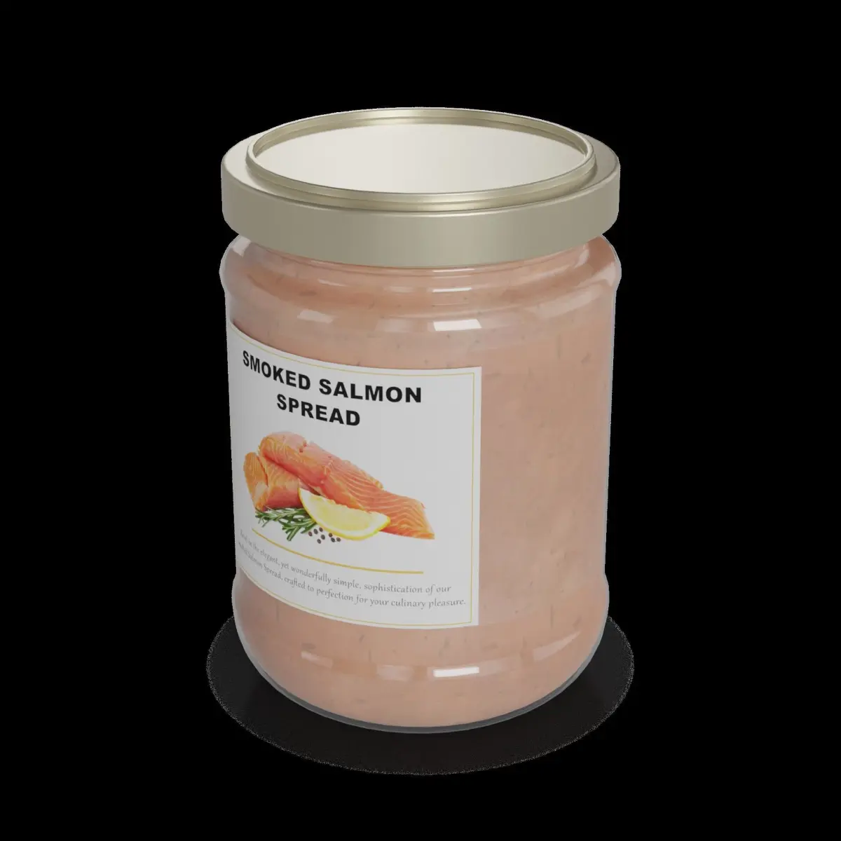 Smoked Salmon Spread: A delicious blend of smoked salmon, cream cheese, and herbs, packed in a sleek glass jar. The packaging features a label with a picture of a salmon and the words Smoked Salmon Spread in elegant font. The jar is sealed with a silver lid for freshness. Net weight: 200g.