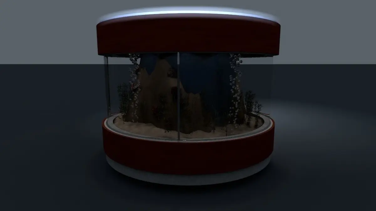 A fishtank made from a pillar of a house, with sand and fishes, internal illumination