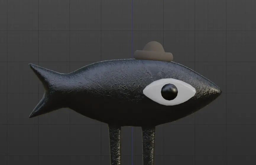 Meet the quirky walking fish! This whimsical 3D model features a sleek black fish body with a single expressive eye, perched atop two long, skinny legs. Adding to its charm, the fish sports a stylish brown hat and matching textured shoes, giving it a playful yet sophisticated look. The minimalist design and muted color palette create a modern, artistic vibe, making it a standout piece for any creative project or collection.