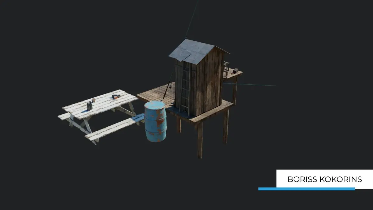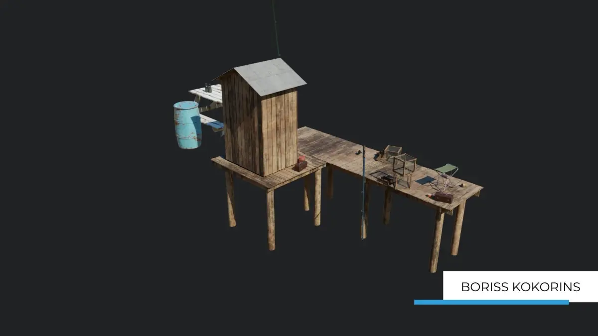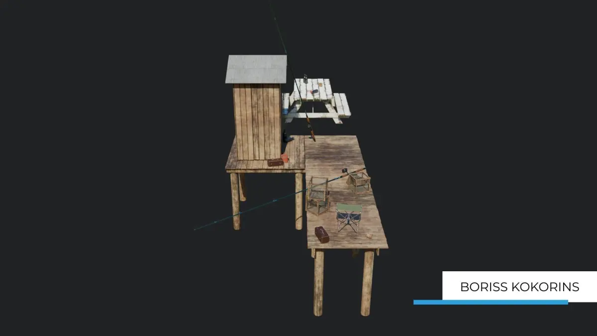 Fisherman's platform near the lake Low-poly game-ready 3D model. All textures are a minimum un 256x256 pixels resolution and maximum 4096x4096 pixels resolution.Models have PBR textures and procedural shaders.