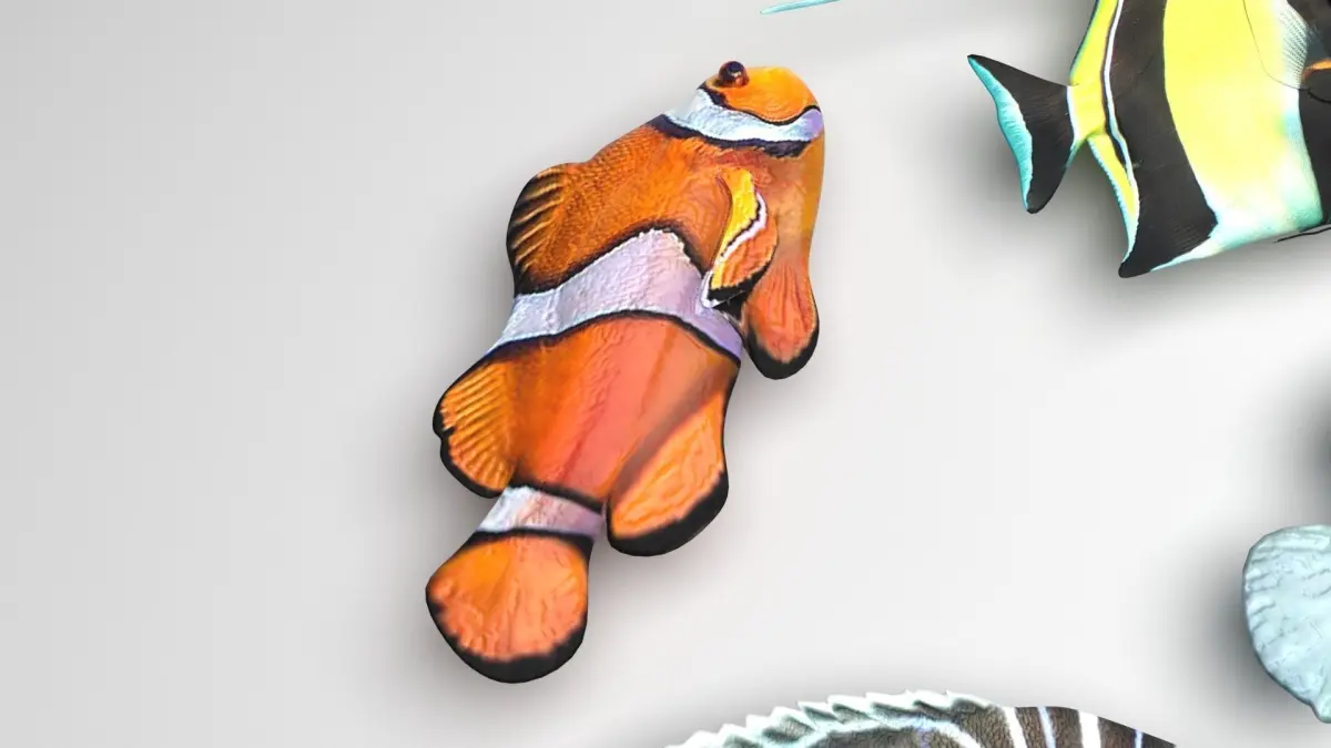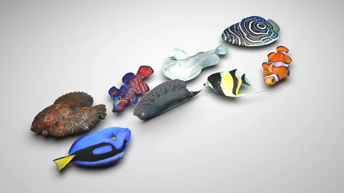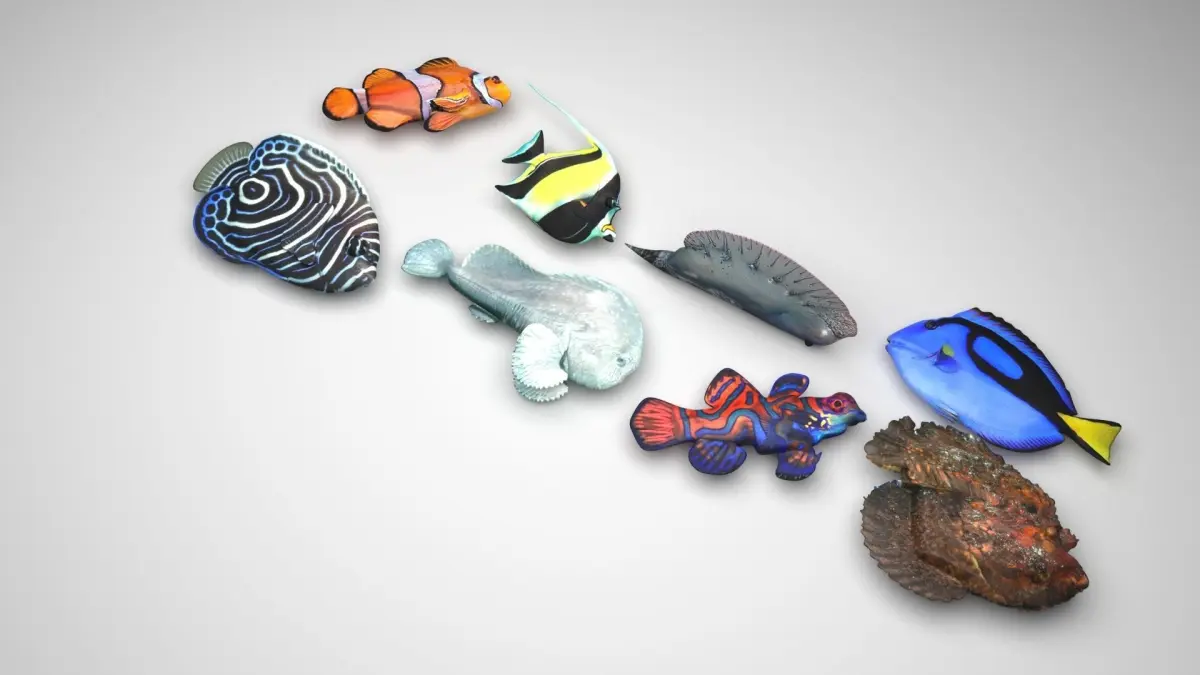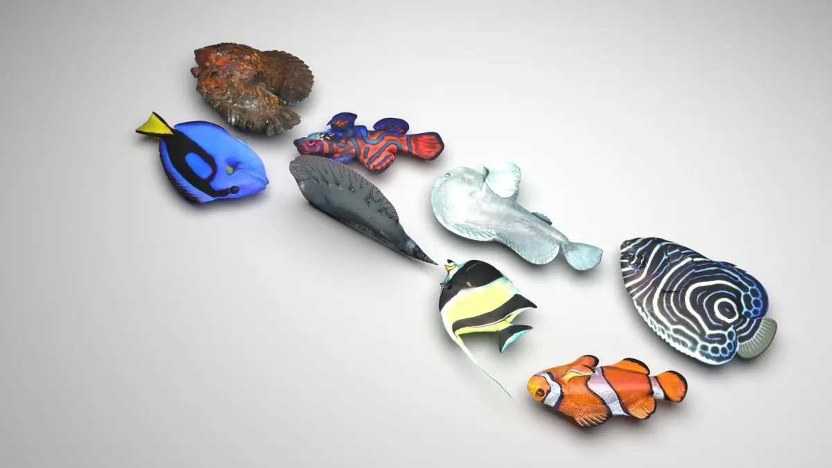 clownfish - 16,080 polygons, 9,654 verticesmoorish idol - 33,430 polygons, 20,422 verticesportuguese man o' war - 9,296 polygons, 4,654 verticesregal tang - 32,344 polygons, 17,586 verticesblob fish - 29,780 polygons, 26,618 verticesjuveline emperor angelfish - 57,020 polygons, 30,998 verticesmandarin fish - 14,496 polygons, 7,254 verticesstone fish - 366,784 polygons, 183,398 vertices