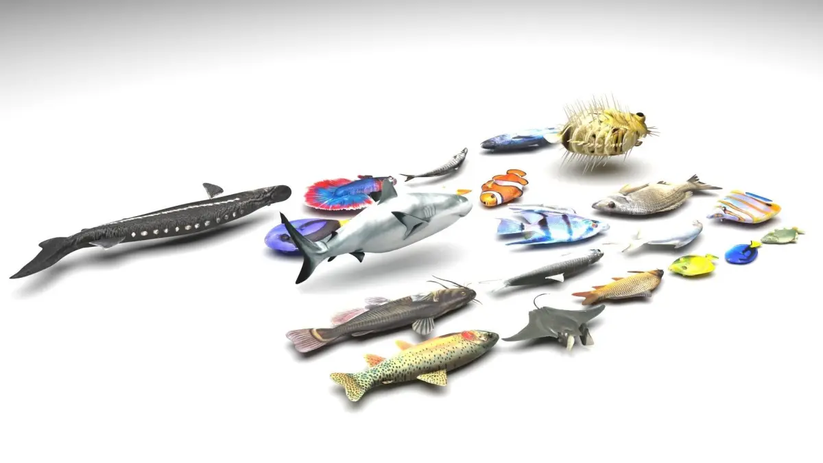21 smootheable polygonal models of fishes with texturesanchovy - 636,051 polygons, 325,300 verticesbullhead - 41,023 polygons, 36,132 verticesbutterfly - 5,216 polygons, 2,614 verticesclownfish - 9,178 polygons, 7,226 verticesgoldfish - 22,090 polygons, 19,866 verticesshark - 12,304 polygons, 6,168 verticesmanta ray - 2,191,392 polygons, 1,095,717 verticesblue tang - 18,286 polygons, 17,814 verticestuna - 15,426 polygons, 13,896 verticesprince - 7,424 polygons, 3,718 verticesbream - 36,669 polygons, 36,076 verticesblowfish - 152,736 polygons, 80,498 verticesbetta - 109,268 polygons, 112,614 verticesbarracuda - 29,252 polygons, 28,190 verticesangel - 13,076 polygons, 7,278 verticessterlet - 23,885 polygons, 13,446 verticescarp - 7,440 polygons, 3,732 verticesyellow tang - 5,684 polygons, 3,654 vertices