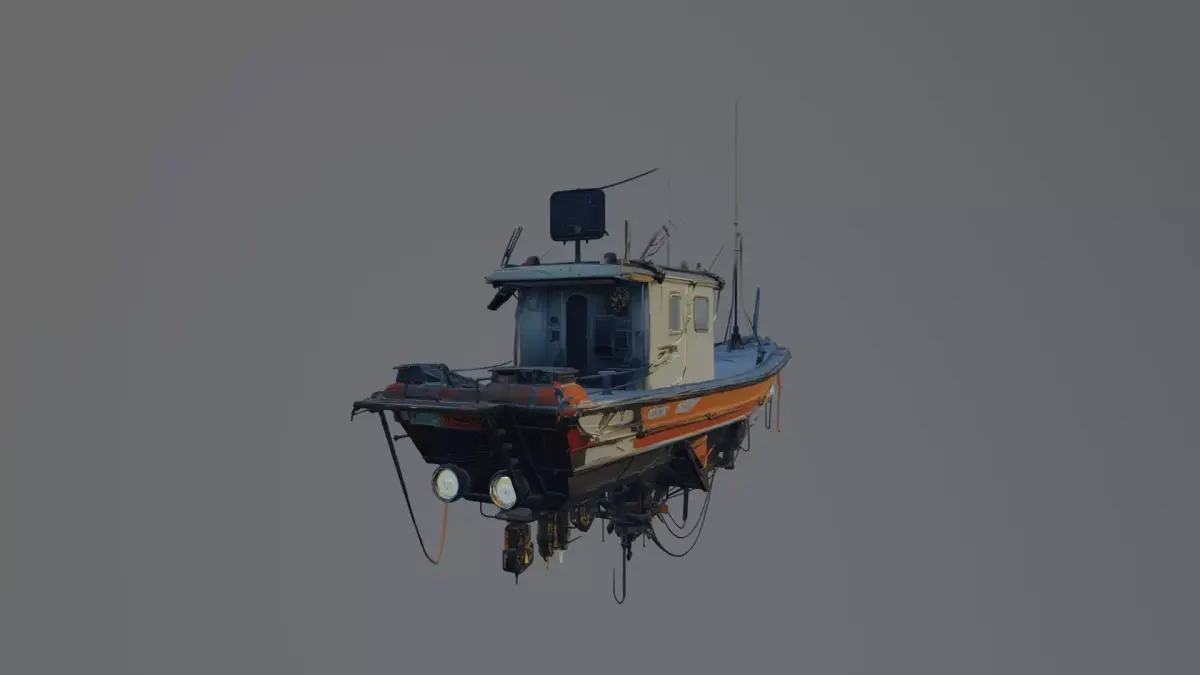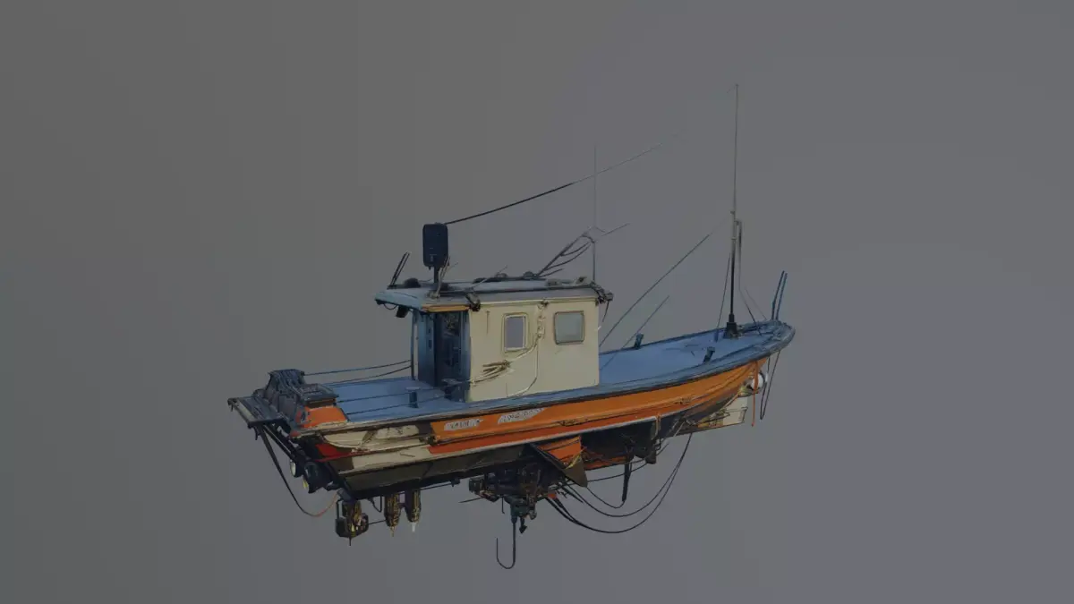 A compact fishing boat with a weathered hull, small cabin, and extended antenna rigging. The design features exposed cables, mechanical components, and a slightly modified underside structure, giving it a unique industrial or semi-futuristic feel. Suitable for harbor scenes, coastal environments, or stylized maritime settings.