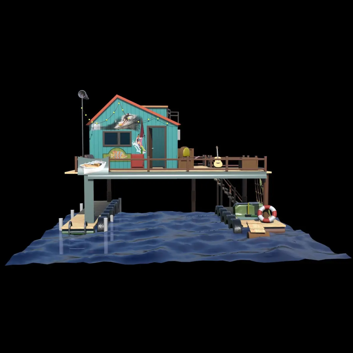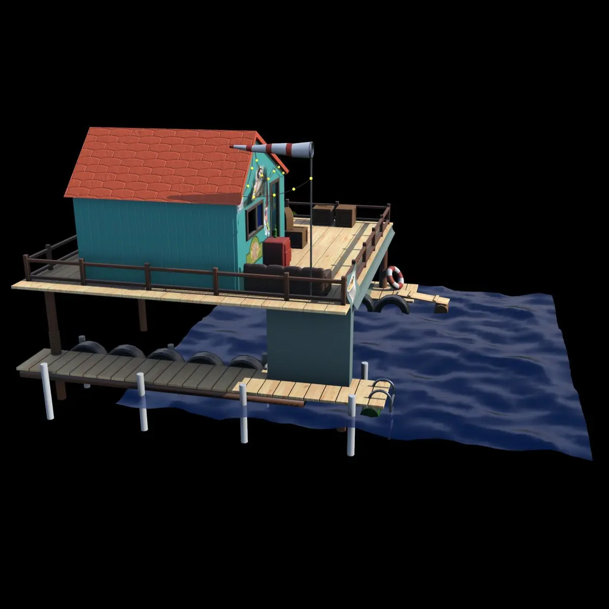 Low poly model of a fishing lodge. Contains 29129 polygons, 29745 vertexes. The model is ready for use in game engines or VR/AR projects.