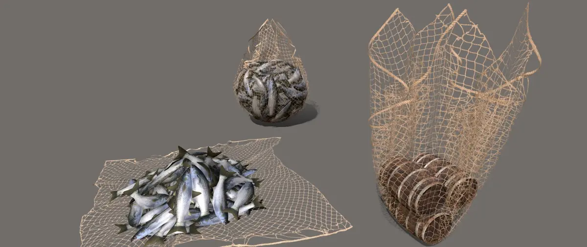 Low poly fishing net. There are Three versions : 1 - fish inside the net 2 - pile of fish on top of the net 3 - barrels inside the net