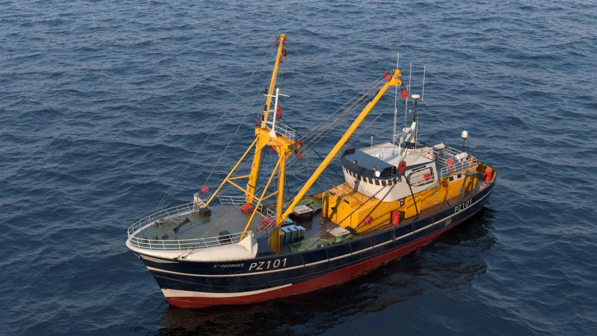 Fishing Trawler a modern marine commercial fishing boat or ship vessel that is designed to operate industrial food fishing trawls, make sea fishes and ocean seafood freezing, and make the industrial fishes and seafood processing technology operations.