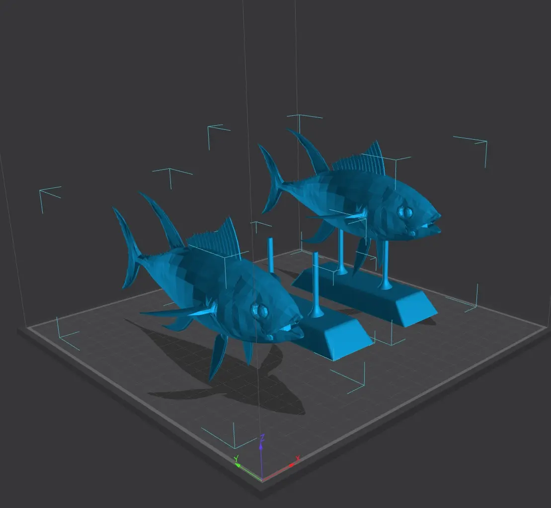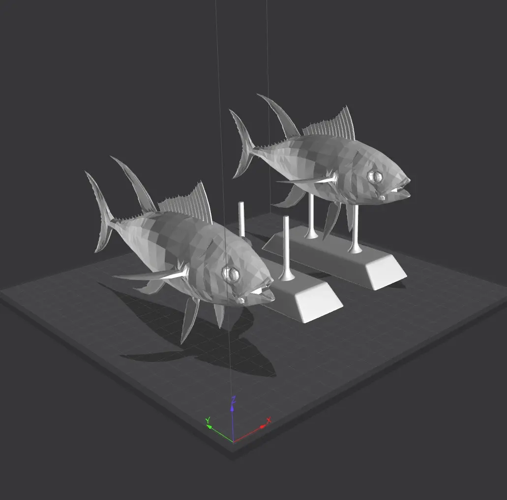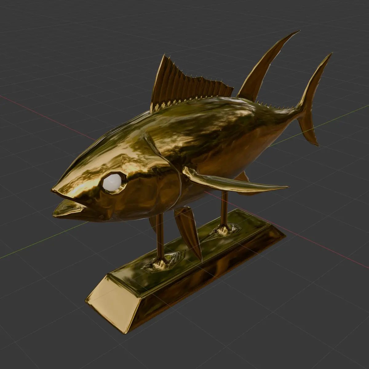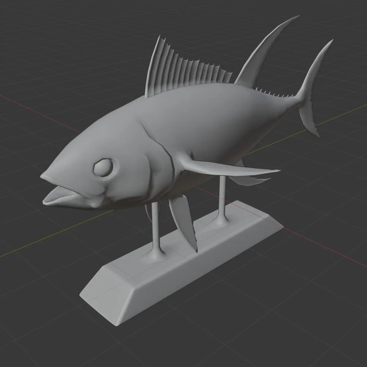 Description: 3D printable blue tuna fishing trophy.3D printing: Print with at least 15% infill, use at least two wall layers and print with supports