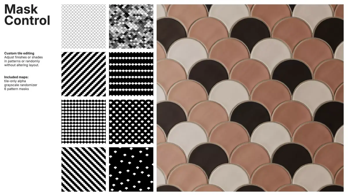 Pattern and random masks allow independent control of tile and grout colors, enabling global, per-pattern or per-tile adjustments without disturbing the layout. Tile-only alpha, a grayscale randomizer and pattern masks ensure full customization for complex designs.
