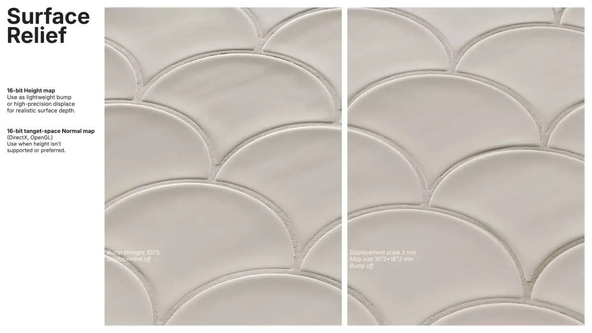 Surface relief is provided by a RAW 16-bit height map tuned for a true 3 mm depth (1872×1872 mm surface), suitable for lightweight bump or precise displacement. A 16-bit tangent-space normal map (DirectX/OpenGL) is included for cases where height-based workflows aren’t preferred.
