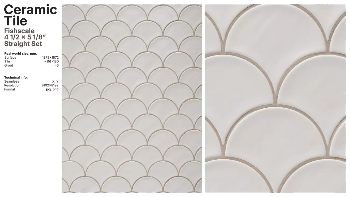 The package includes 8 diffuse variations with matching grout tones, and a flexible color base that works out-of-the-box or as a starting point for custom looks.