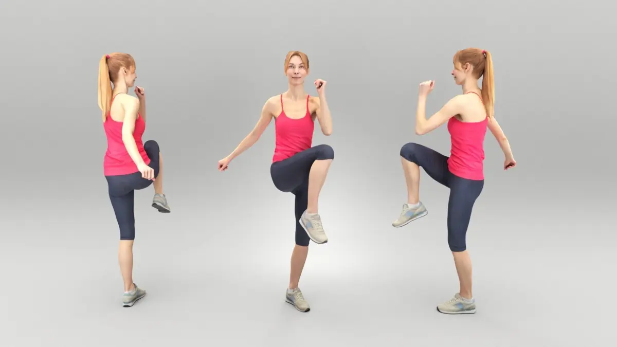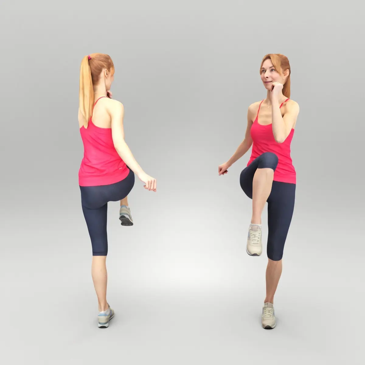 This is a true human-sized and detailed model of a sporty beautiful woman of Caucasian appearance dressed in sportswear. The model is captured in a casual pose to perfectly match various architectural and product visualizations, as a background or mid-sized character on a sports ground, gym, beach, park, VR/AR content, etc.
