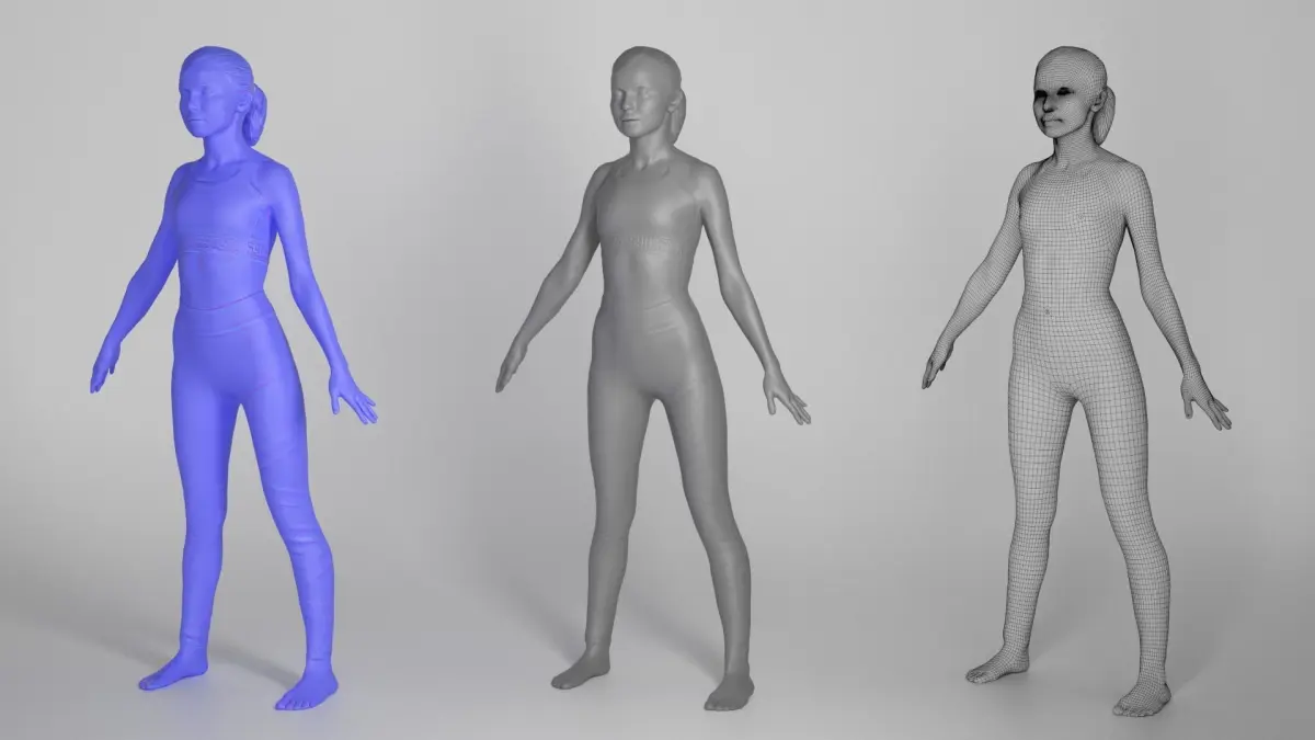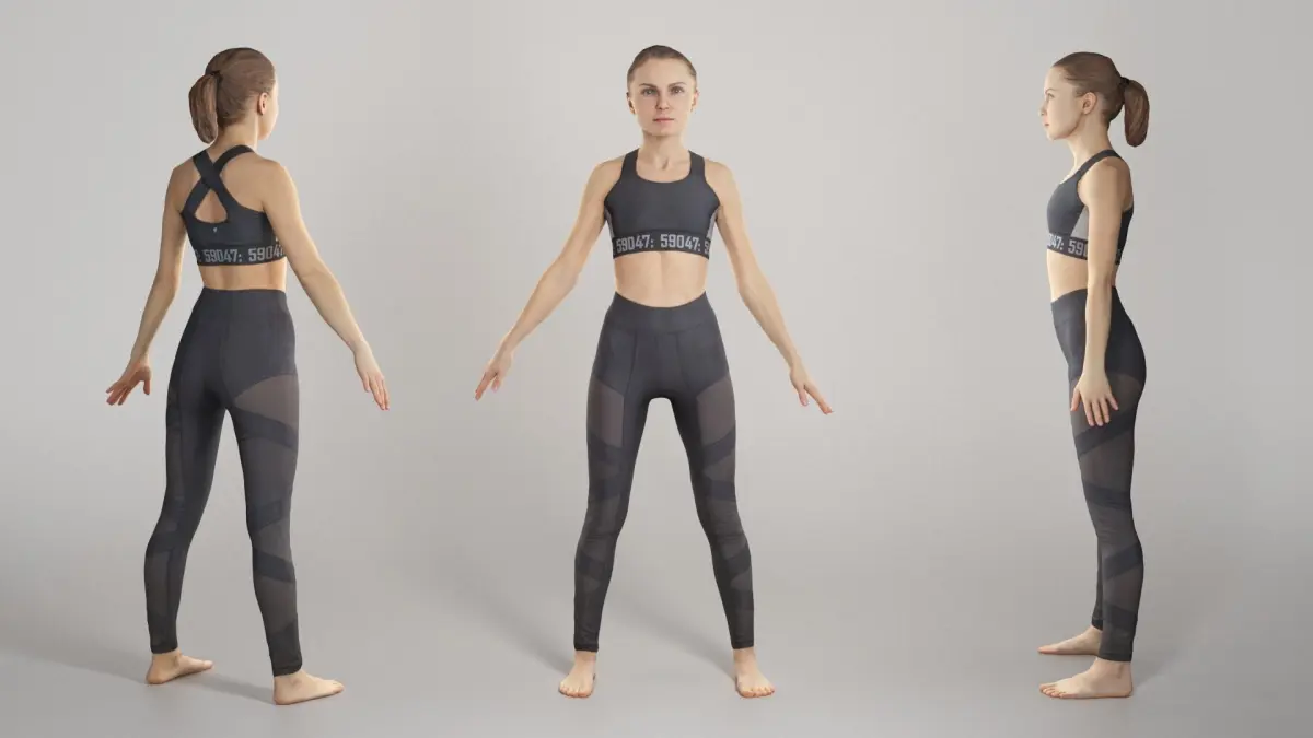 This is a true human size detailed model a beautiful young woman of Caucasian appearance dressed in sportswear. The model is captured in the A-pose with mesh ready for rigging and animation in all most usable 3d software.